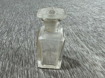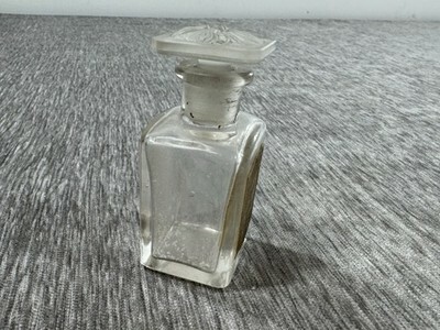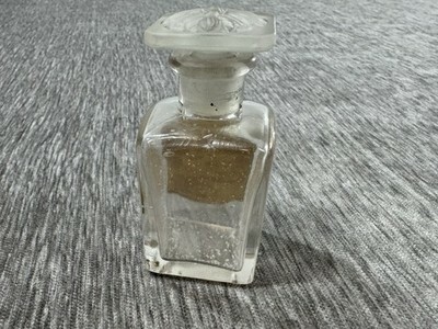 Empty bottle. I am unable to remove the stopper and I did not want to tr y too hard. No chips on the stopper top, but I do not know what the inside looks like. The label has wear, discoloration, etc. Some residue/soiling inside the bottle.