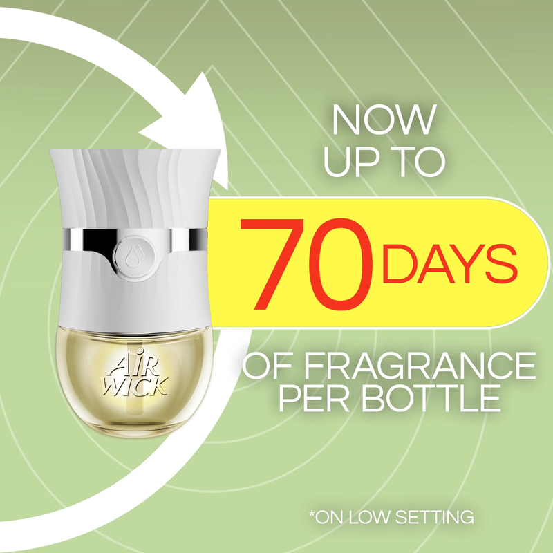 Freshen your home with Air Wick Scented Oil Refills made with 100% natural essential oils. The Fresh Waters scent 2-pack provides up to 70 days of continuous fragrance (on low setting). The updated Air Wick warmer improves airflow, spreading scent in all directions. Enjoy a consistent, welcoming fragrance that reaches every corner of your room with ease and simplicity.