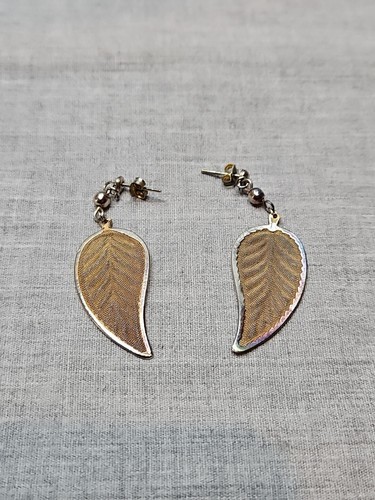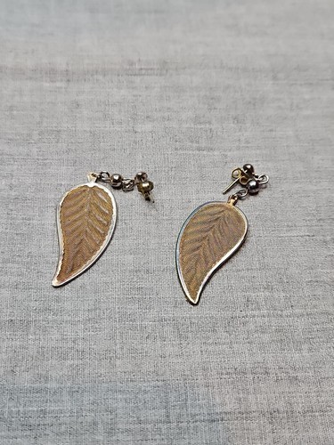 Brown Autumn Leaf Dangle Drop Earrings, Silver Tone Edge, Vintage