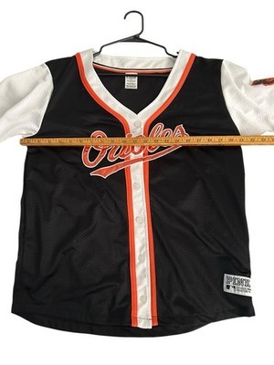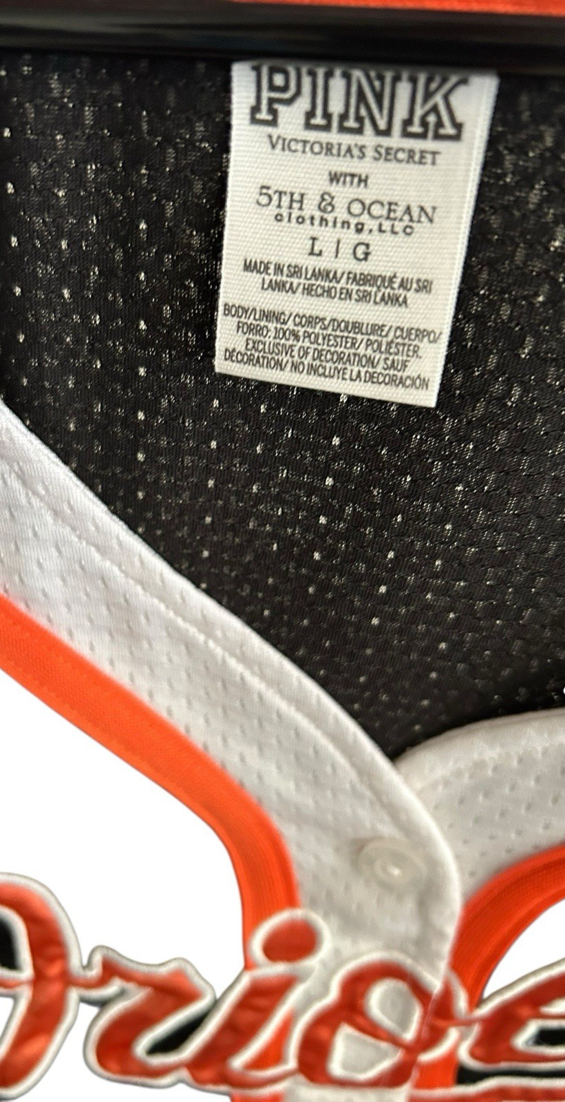 The product is a rare Baltimore Orioles MLB "Pink" jersey for women, designed by Victoria's Secret. This black jersey represents the Baltimore Orioles team in Major League Baseball (MLB) and is the perfect fan apparel for any baseball enthusiast. Made in Mexico, this large jersey is a unique and stylish addition to any sports memorabilia collection, ideal for showing support for the Baltimore Orioles during the regular season games.