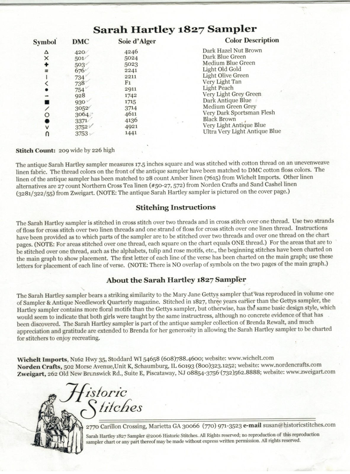Sarah Hartley 1827 Sampler by Historic Stitches cross stitch pattern