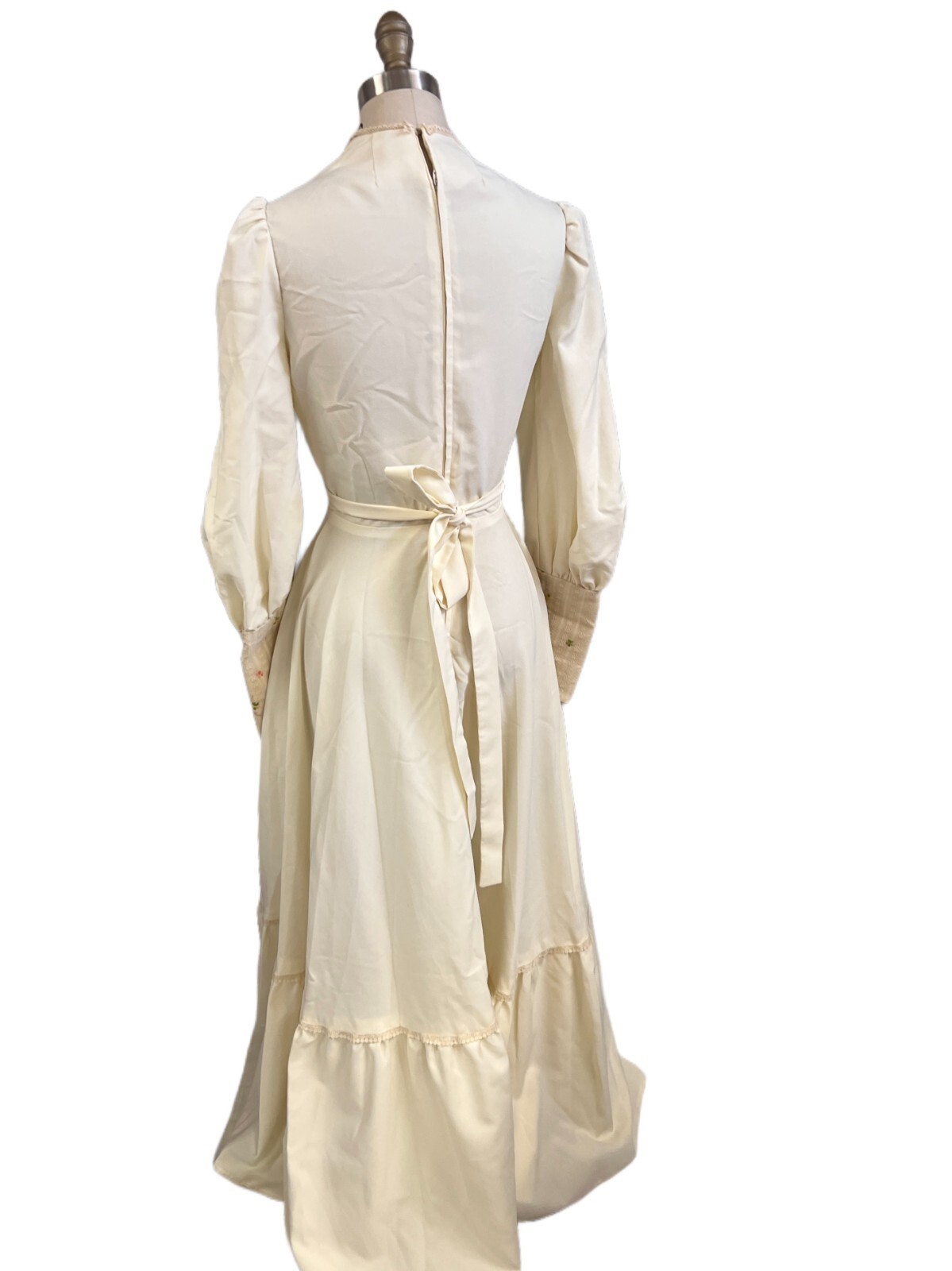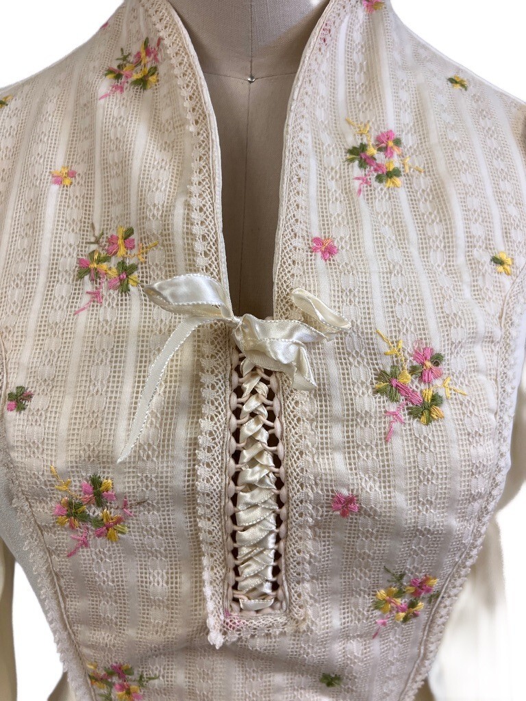 VTG 1970s Prairie Gown Queen Anne Corset Bodice Bishop Sleeve Embroidered S/M