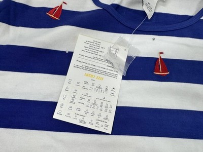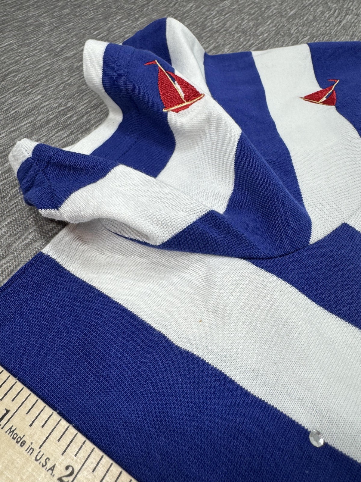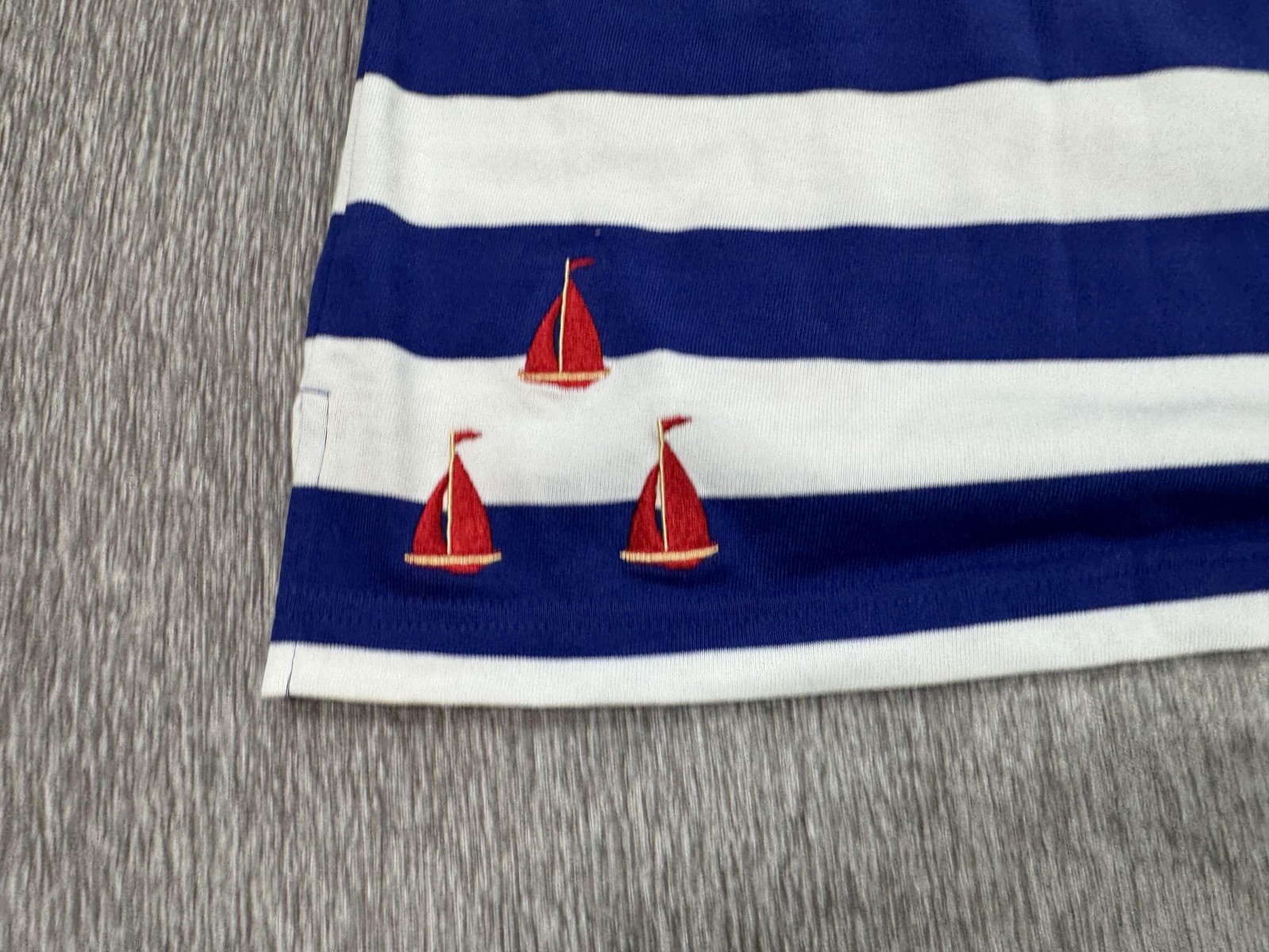 Design details: Red embroidered sailboats across front; additional sailboat embroidery at back hem