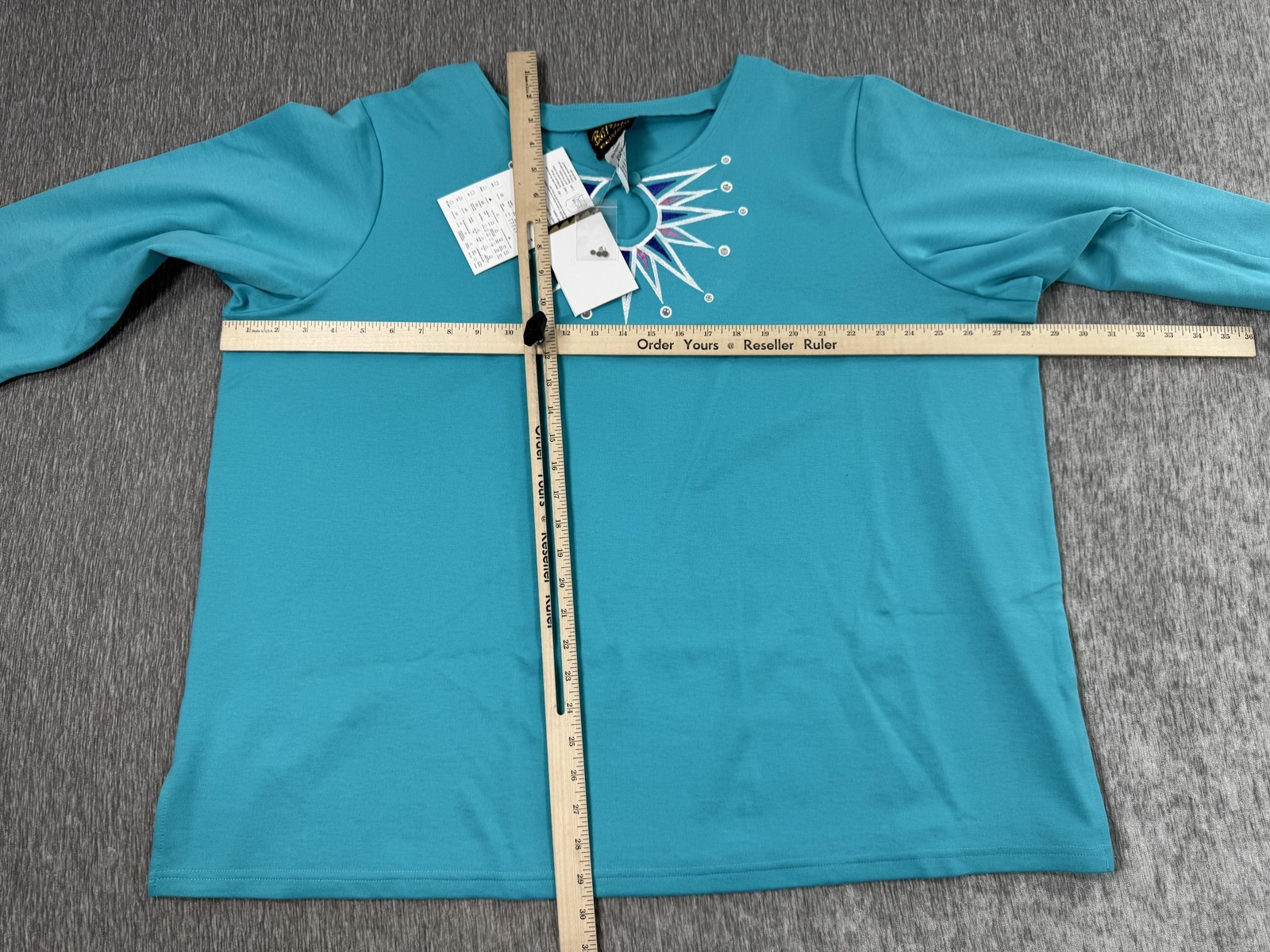 Bob Mackie Wearable Art Shirt Womens 3X Teal Embellished Keyhole 3/4 Sleeve Top