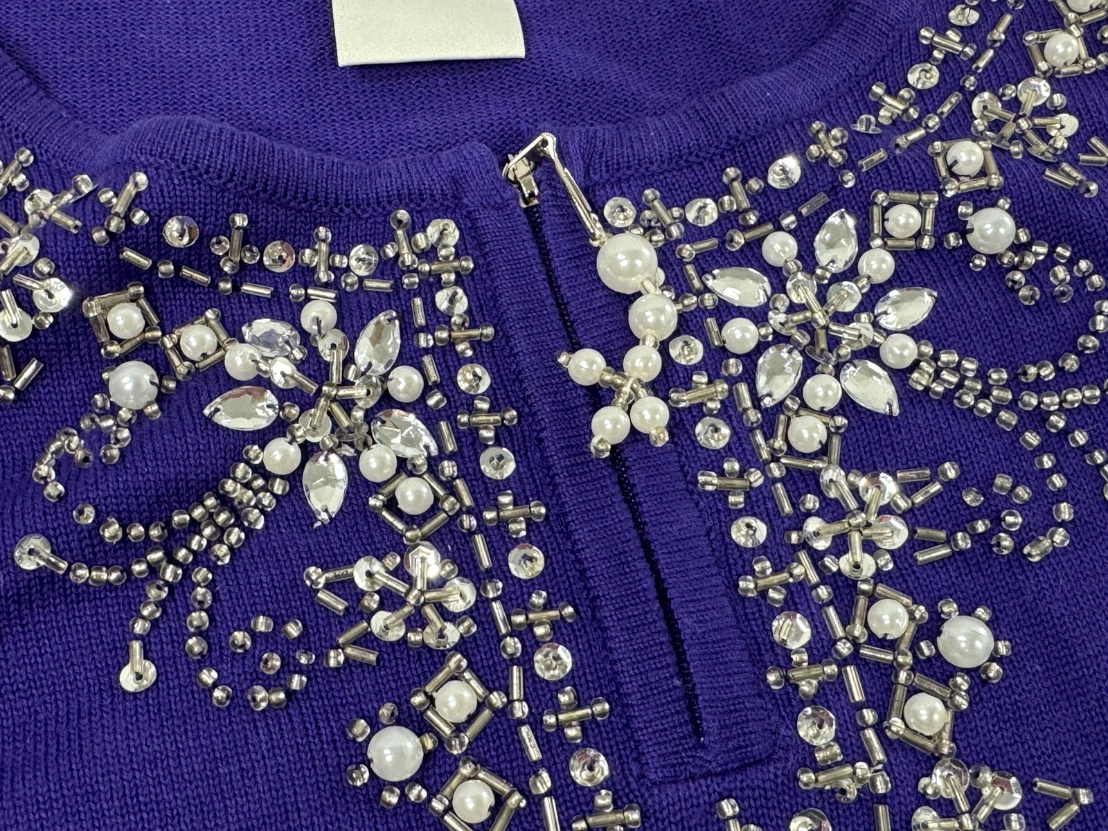 Embellishments: Rhinestones, beads, and faux pearls in floral/scroll motifs at neckline; matching trim at sleeve cuffs and side slits