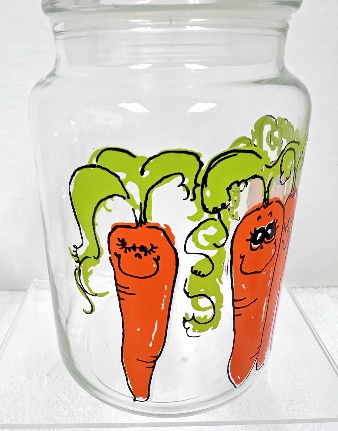 Vintage Hildi Anthropomorphic Happy Carrot Glass Canister Jar 7" Anchor Hocking In great shape the lid is not super dumper tight, but it does fit and seal we have others for sale with different vegetables and can combined shipping