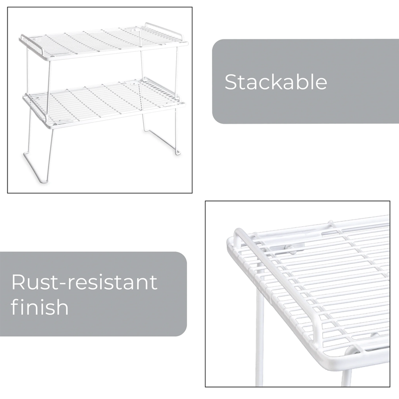The Mainstays Folding Stacking Shelf helps keep your kitchen organized and provides more space wherever it is used. Its design provides a proper amount of space for your largest and smallest items, and the entire frame has a rust-resistant finish, the coated white wire is easy to clean simply wipe with a damp cloth. Use the shelves in your kitchen cabinets to organize your dishes, in your pantry to provide more space to store can goods and other foods. You will love the ease of the shelves and will want to have them in multiple rooms of your home! Use them in your closet, bathroom, pantry, kitchen, or anywhere you need extra space.