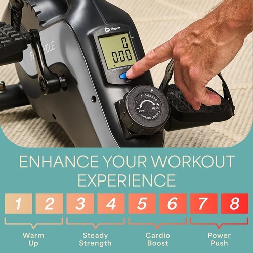 Stay active, improve circulation, and support your physical therapy goals?all while seated. The Lifepro FlexCycle under desk bike pedal exerciser is designed to bring low-impact workouts to your home or office with whisper-quiet performance and full-body versatility. Whether you're a senior looking to maintain mobility, an office worker breaking up sedentary hours, or recovering from injury, the FlexCycle fits effortlessly into your routine. Its compact design slips easily under most desks, allowing you to pedal while working, reading, or watching TV. More than just a leg exerciser, the FlexCycle includes features for both upper and lower body workouts. Use the resistance bands and interchangeable pedals to engage your arms or legs, helping improve joint flexibility, boost circulation, and rebuild strength through gentle movement. Customize your workouts with 8 levels of magnetic resistance?from light rehab to more vigorous cardio training. The built-in LCD display tracks your time, distance, speed, and calories burned, keeping you informed and motivated during each session. This makes it a valuable choice for seniors and anyone managing physical therapy progress with real data. Portable, sturdy, and simple to use, the FlexCycle is a complete solution for in-place fitness. Whether you're recovering, maintaining, or building strength, Lifepro helps you move with purpose?anytime, anywhere.