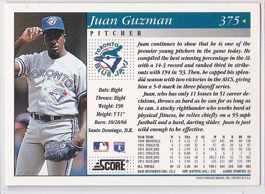 M) 1994 Score Baseball Trading Card - Juan Guzman #375