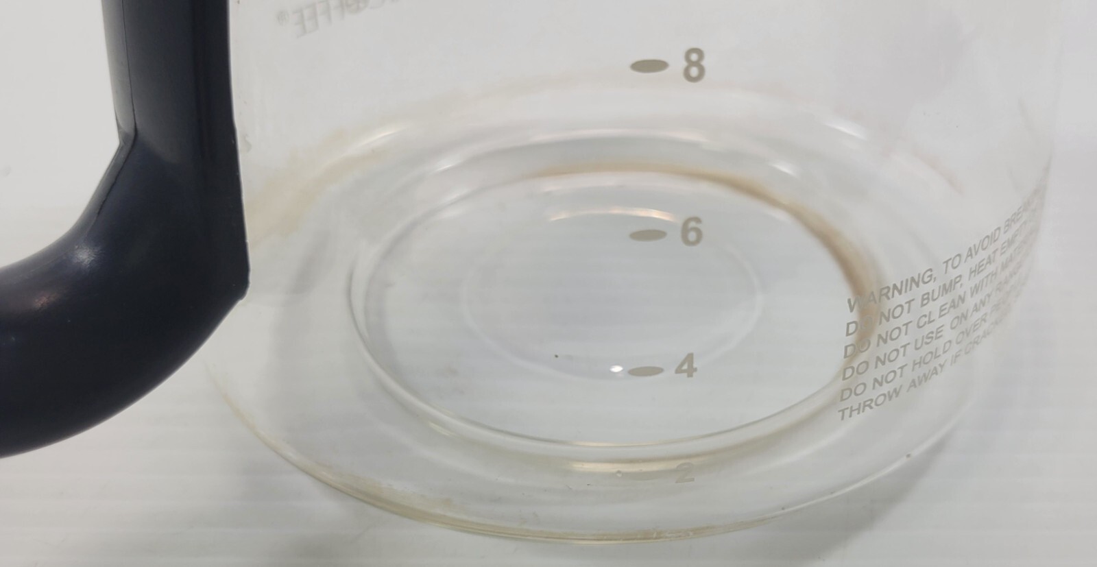 Carafe is in overall good used conditions with no chips or cracks but glass has some coffee staining due to use.