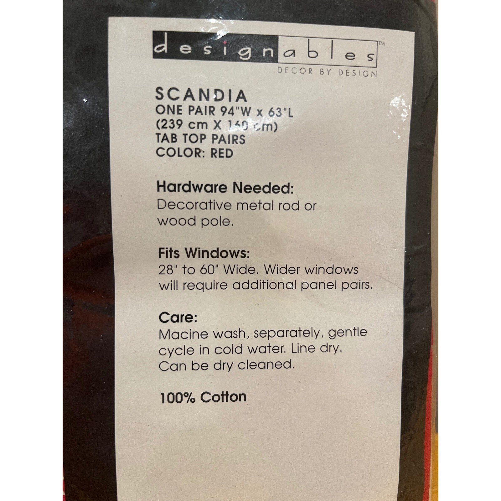 A stylish addition to your home decor: Designables Scandia curtain panels. This set includes a pair of tab top curtains, each measuring 94 inches in length and 63 inches in width. The striking red color and geometric pattern add a modern touch to any room. Designed to fit windows 28 to 60 inches wide, these panels are easy to install on a decorative metal rod or wood pole. Perfect for adding a pop of color to your living room or creating a cozy atmosphere in your bedroom.