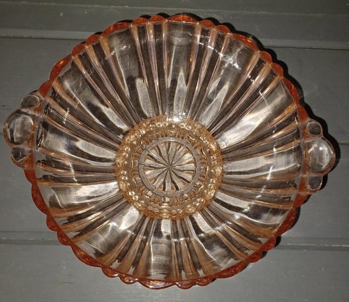 Anchor Hocking Old Cafe Pink Depression Bowl Tab Handles. This measures approximately 7.25 inches (including the handles) across and 2.6 inches tall.