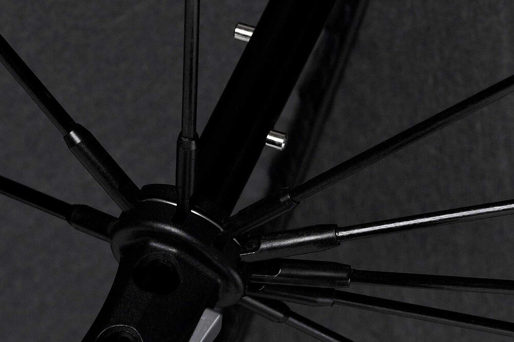 Windproof and extra lightweight frame made of glass fibers: very robust, especially tempered glass fiber shaft; highly elastic, nearly unbreakable glass fiber ribs; all frame parts are corrosion-proof and durable