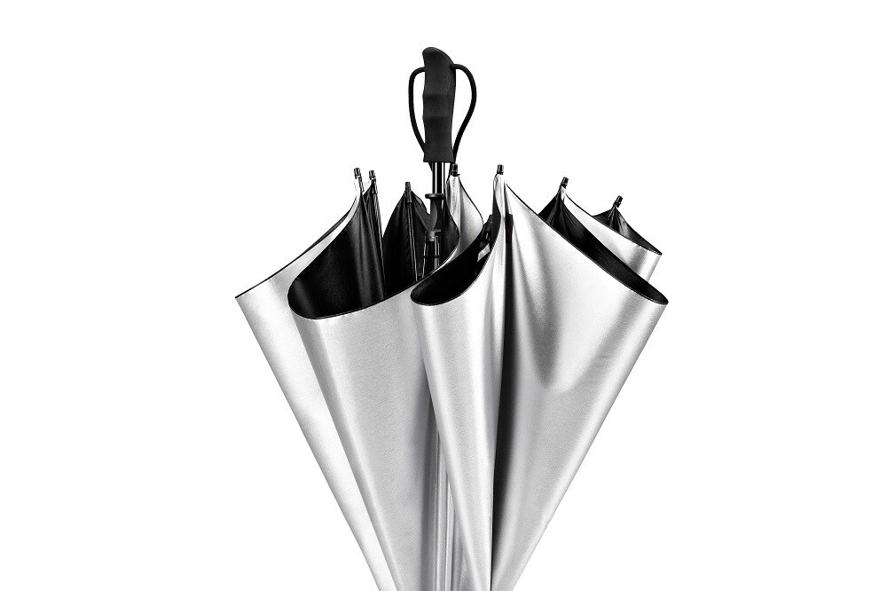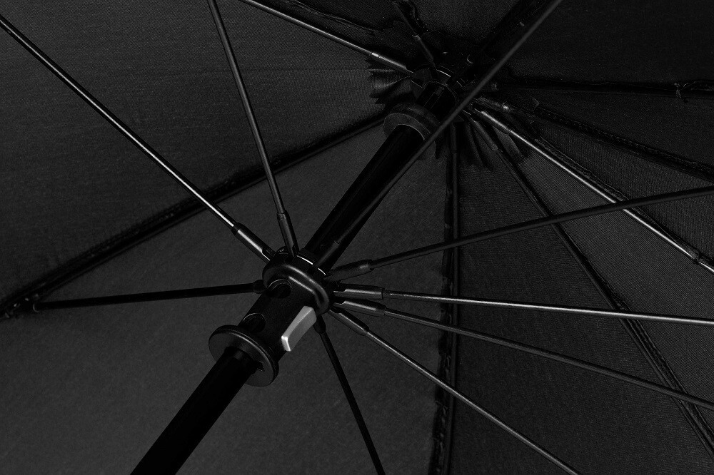 When opened by the safety runner, the three rear segments of the stick umbrella extend automatically. This additional canopy protects the space between back and backpack perfectly from rain. When the umbrella is closed, the canopy extension automatically folds back inwards and becomes invisible again