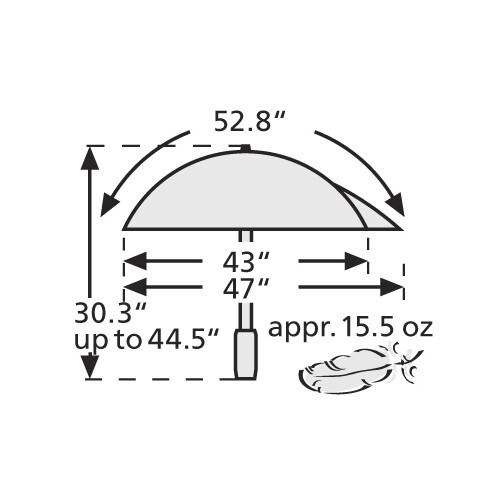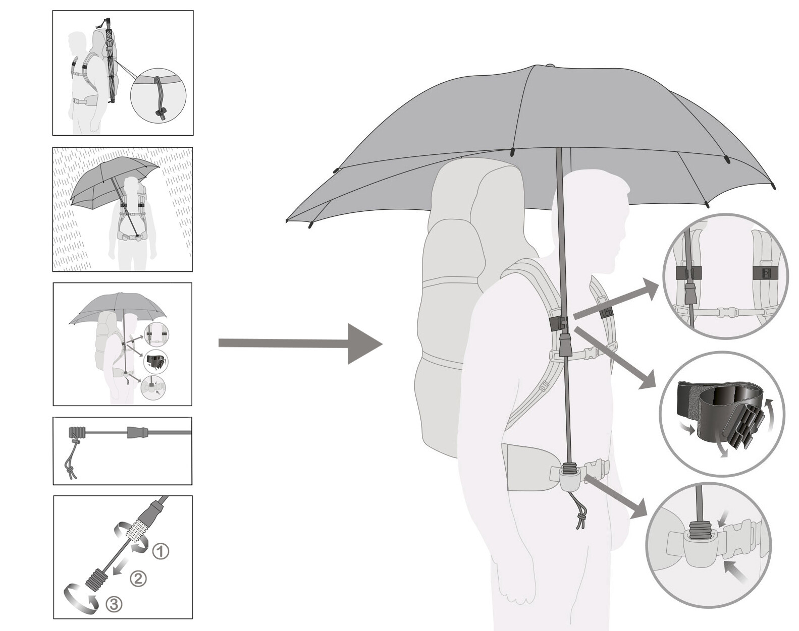 Swing backpack handsfree ? The handsfree backpack umbrella with extra extended canopyThe Swing backpack handsfree is the ultimate umbrella for all outdoor enthusiasts who travel with a larger backpack and want to have both hands free when touring. When the special umbrella is opened, the canopy is automatically extended at the three rear segments, so that both the hiker and the backpack are perfectly protected from the rain. In addition, the shaft of the trekking umbrella can be extended steplessly and easily attached to any standard rucksack with a hip belt - or alternatively to our carrier strap system. This leaves both hands completely free, free to hold trekking poles, free to operate the GPS, or even to use the camera. Very robust shaft of glass fibres; highly elastic and windproof frame of glass fibres; all frame parts are corrosion-proof and durable When opened, the three rear segments extend automatically. When the umbrella is closed, the canopy extension automatically folds back inwards The shaft can be extended by means of a small twisting movement it is adjustable in any desired position to the own body size With the included retaining clips, the shaft is simply attached to the left, right or diagonally to the shoulder straps of the backpack and aligned according to the direction from which the rain or sun comes The two small pouches included in the scope of delivery are attached to the hip belt with hook and loop fastener. The umbrella handle is conveniently anchored in these small bags Fast drying canopy of extra lightweight polyester fabric Grip friendly hard foam handle with adjustable carrying strap The Swing backpack handsfree can also be used as an ordinary umbrella The convenient protection case with net insertion provides optimal airing. The closed umbrella can be back carried comfortably thanks to the slip-free, adjustable and removable shoulder strap Accessories: Two turnable fastening clips to attach the opened umbrella to the shoulder straps of the backpack Two pouches with hook and loop fastener for attaching the umbrella handle to the hip belt Protection case with net insertion as well as adjustable and removable shoulder strap Two elastic loops for attaching the closed umbrella to the outside of the backpack Weight: 15.36oz (435.4g)Canopy: 57" (144.8cm)Open Width: 50" (127cm)Open Length: 44.5" (113cm)Closed Length: 30.25" (76.8cm)
