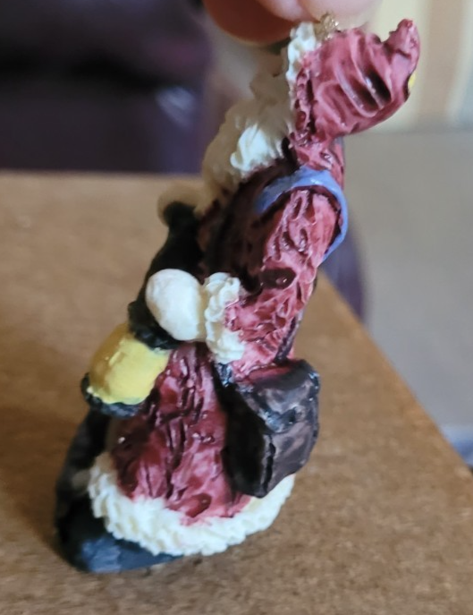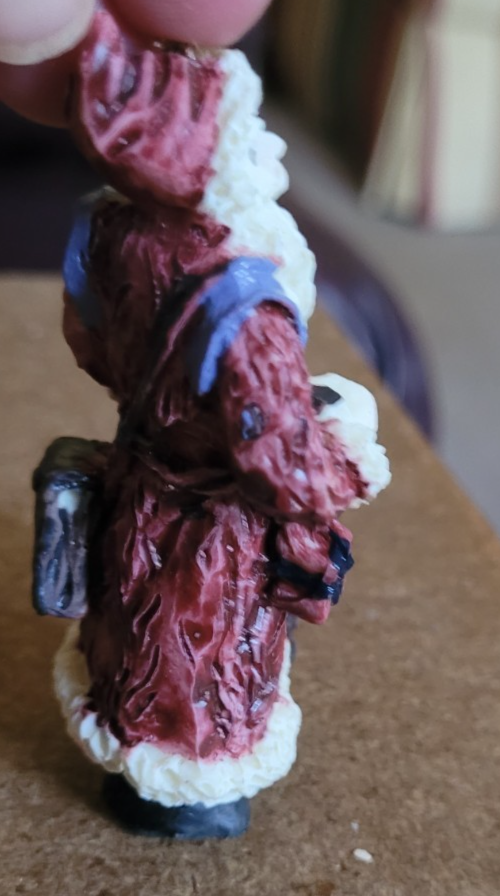 This Santa is in good used condition. It measures approximately 3 inches tall. There are no chips or cracks that I found. It does not stand well. Not sure why. Nothing appears to be broken.