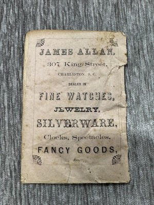 Back cover: "James Allan, 307 King Street, Charleston, S. C. Dealer in Fine Watches, Jewelry, Silverware, Clocks, Spectacles, Fancy Goods, c."