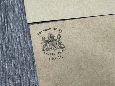 Front/Hotel side text: "BEDFORD HOTEL" with crest and "17, RUE DE L'ARCADE" "PARIS" printed in black.