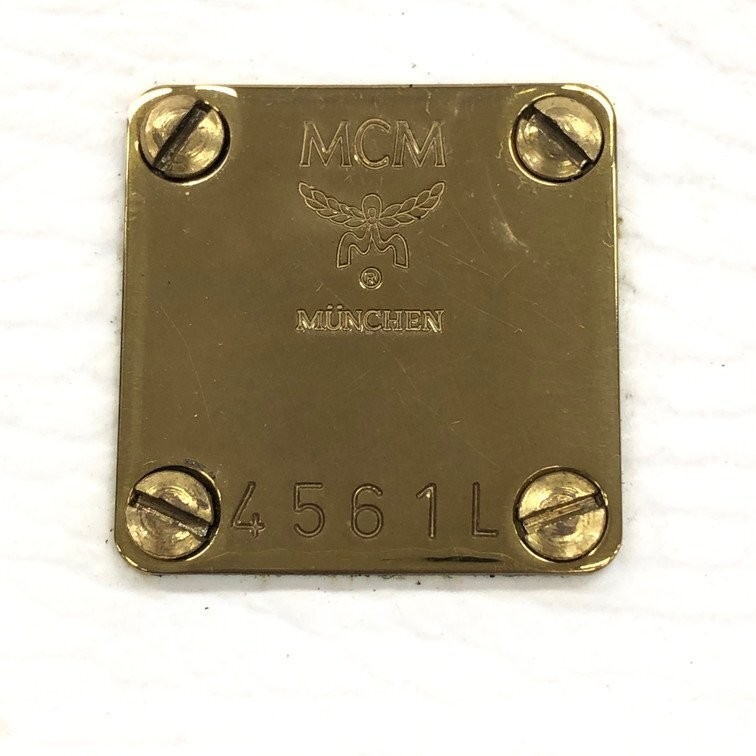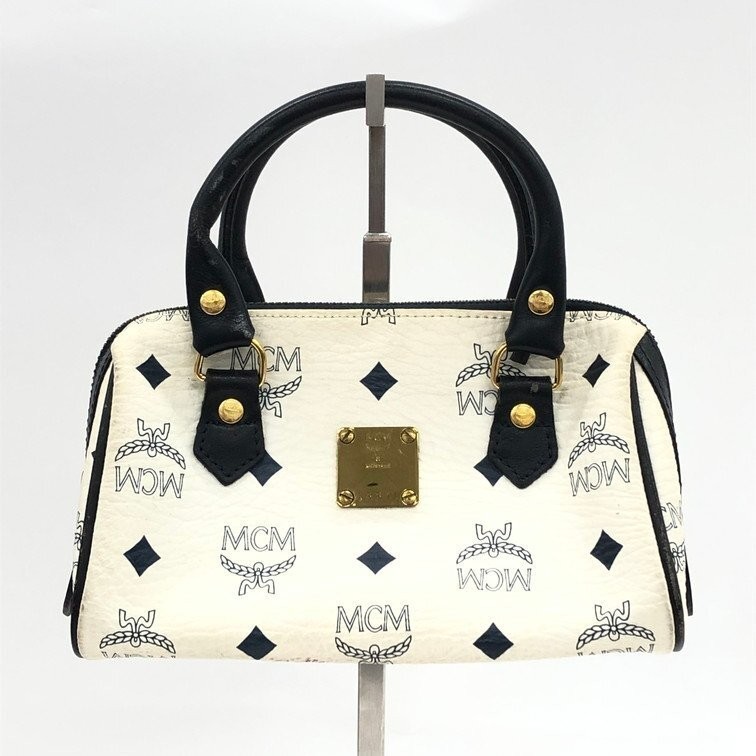 The MCM Mini Bag 4561L is a stylish handbag featuring a zip closure and gold hardware accents. Made from a combination of leather and PVC materials, this mini handbag is part of the MCM Boston product line and is designed for women looking for a chic and compact accessory. The exterior color is white, giving it a sleek and sophisticated look, while the leather handle adds a touch of luxury to the design. Perfect for everyday use or special occasions, this MCM handbag is a versatile and fashionable choice for any woman's wardrobe.