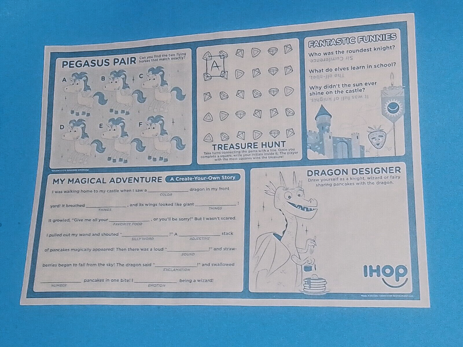 This IHOP Children's Restaurant Menu Coloring Games "Get Moving!" set of ten - 10 - is perfect for kids who love to color and play games. The set includes menus with fun activities like mazes, connect the dots, and coloring pages featuring beloved characters from the magical world.
