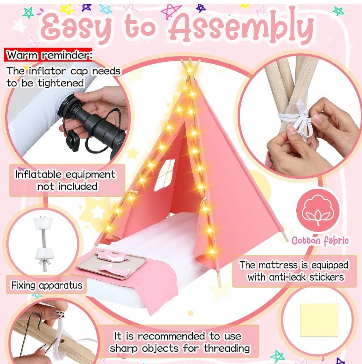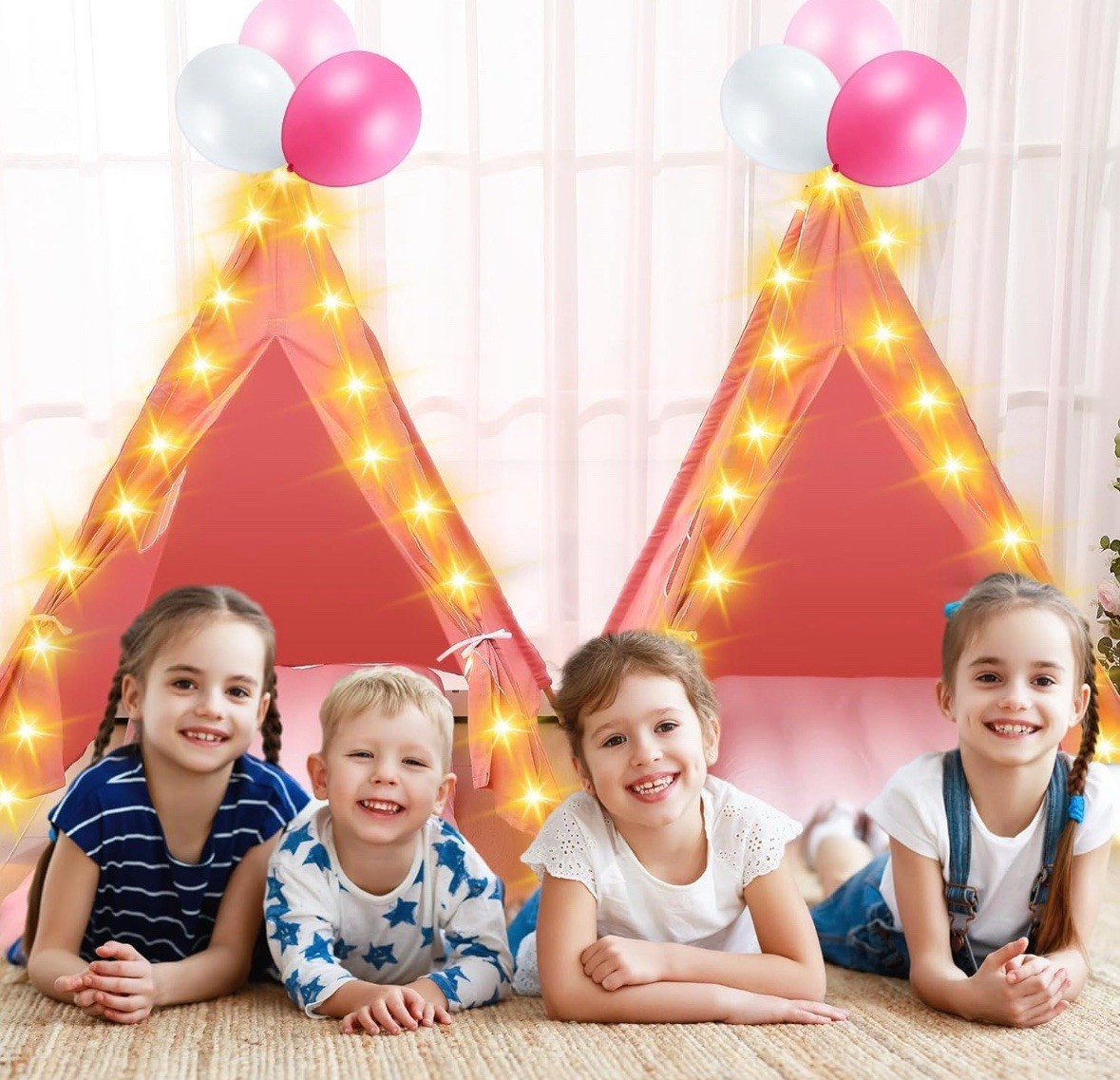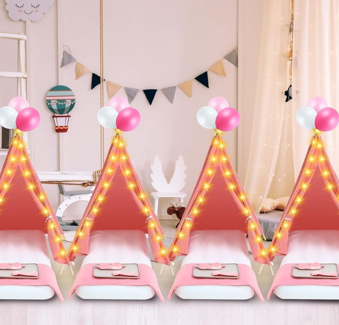 Each tent features a charming pink canopy with warm string lights and festive balloons, perfect for birthdays, pajama parties, or playtime.