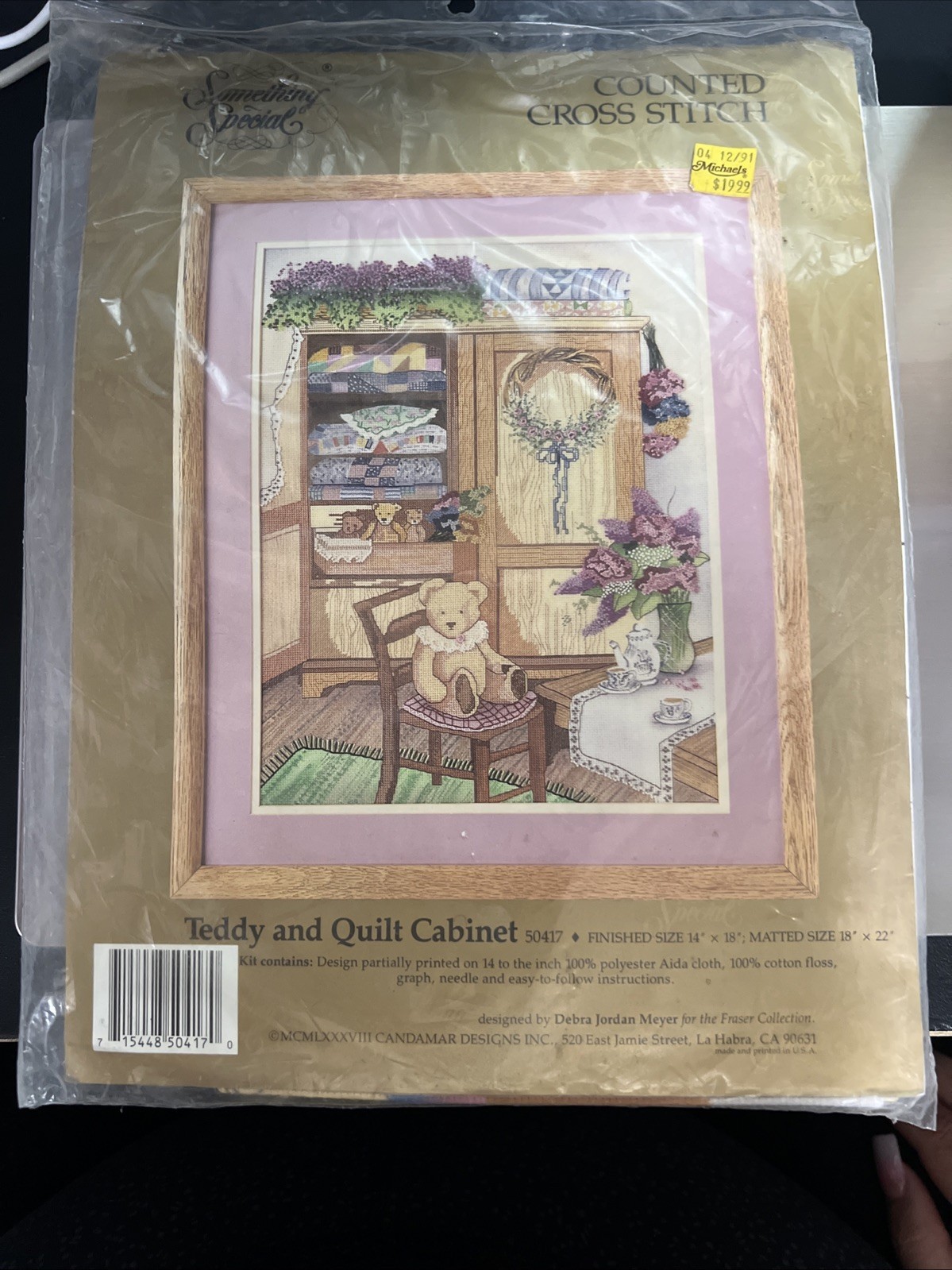 The 1988 Something Special Teddy Quilt Cabinet Candamar Design 50417 is a cross-stitch kit featuring a charming teddy bear and quilt cabinet theme. Created by Candamar Designs in the United States, this kit includes everything needed for a delightful hand-embroidery project. With its counted cross-stitch style, this kit is perfect for crafters looking to create a special and unique piece for their home or as a gift for a loved one.