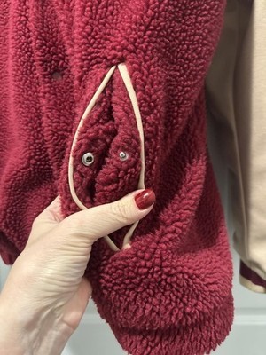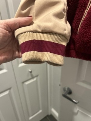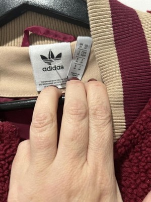 Adidas varsity jacket featuring a burgundy sherpa fleece body and beige sleeves.