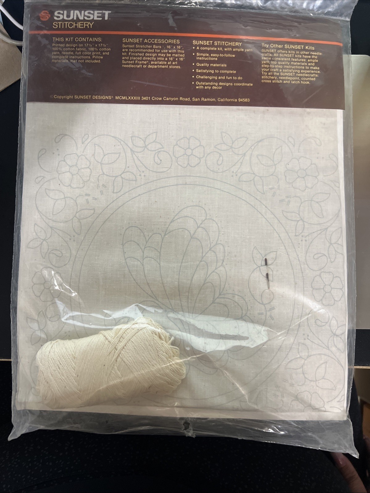 The Sunset Stitchery "Colonial Butterfly" Vintage 1983 16? x 16? hand embroidery kit features a charming design of a butterfly, perfect for crafters who enjoy stitching animals and insects. This kit includes a frame or pillow option, along with a needle and fabric/cloth for embroidery. With the brand's reputation for quality and attention to detail, this vintage kit offers a nostalgic and creative project for embroidery enthusiasts.
