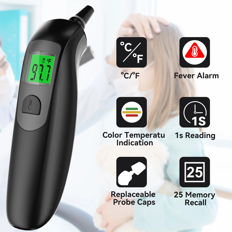 High accuracy and stability Ear and forehead mode Large LCD screen Fever Alarm 25 set memories recall 3 Colors Backlight Includes 2*AAA batteries