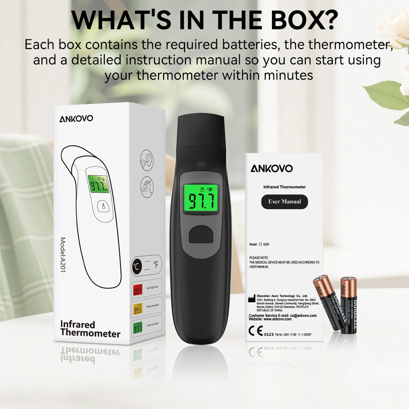 ANKOVO forehead and ear thermometer for adults and babies kids is equipped with the latest infrared technology, measures the temperature based on the infrared energy emitted from the eardrum or the forehead. You can quickly obtain the measurement results. ANKOVO digital thermometer take temperature less than 1 second, 1 button design to measure ear, forehead, room, milk, water and object temperature. And toggle switch Celsius and Fahrenheit. The thermometer has a non-slip design, and LCD display is clear and easy to read, the display can be used at night without in the light.