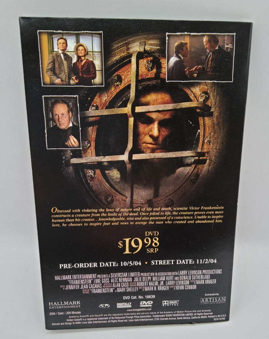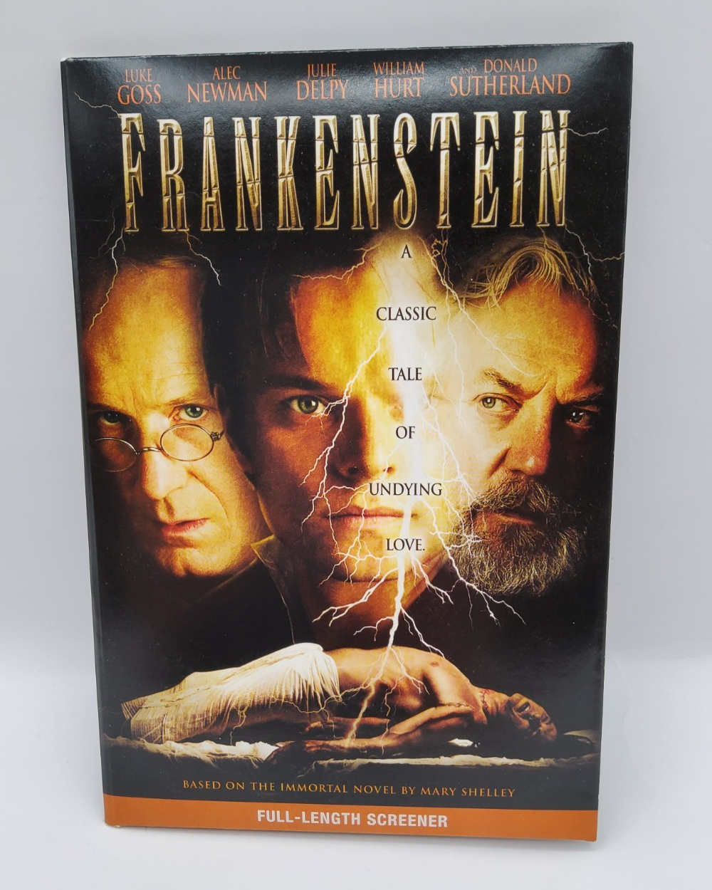 Unleash the power of classic horror with this exclusive 2004 Full-Length Screener DVD of Frankenstein, based on Mary Shelley?s immortal novel. Produced by Hallmark Entertainment and starring an all-star cast ? Donald Sutherland, William Hurt, Julie Delpy, Luke Goss, and Alec Newman ? this grand television adaptation captures the heart and tragedy of one of the greatest stories ever told.