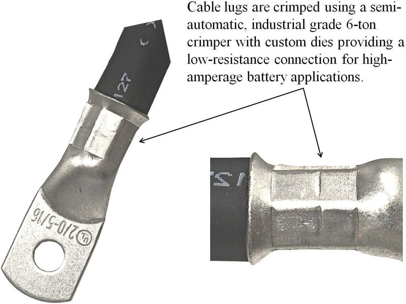 Cable lugs are attached using a 6 ton pneumatic crimper with custom dies, resulting in an ultra-strong, non-removable crimp.