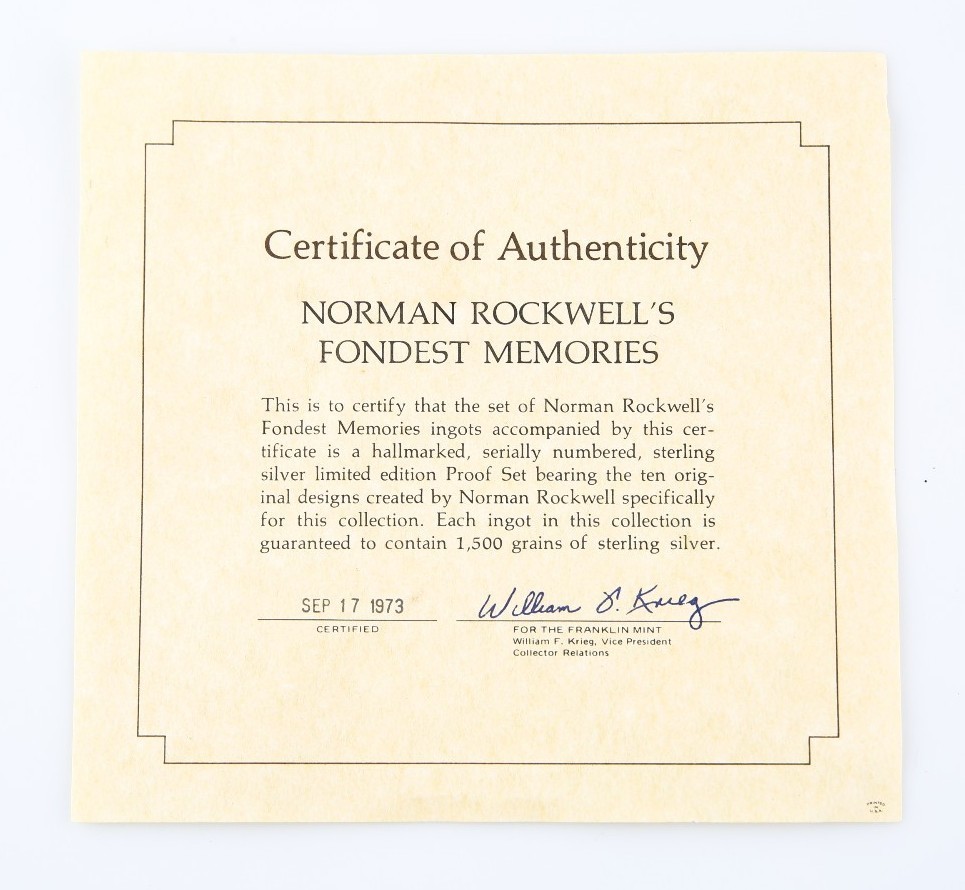 1973 Norman Rockwell Fondest Memories 10x .925 Silberbarren 1. Auflage Proof-Set