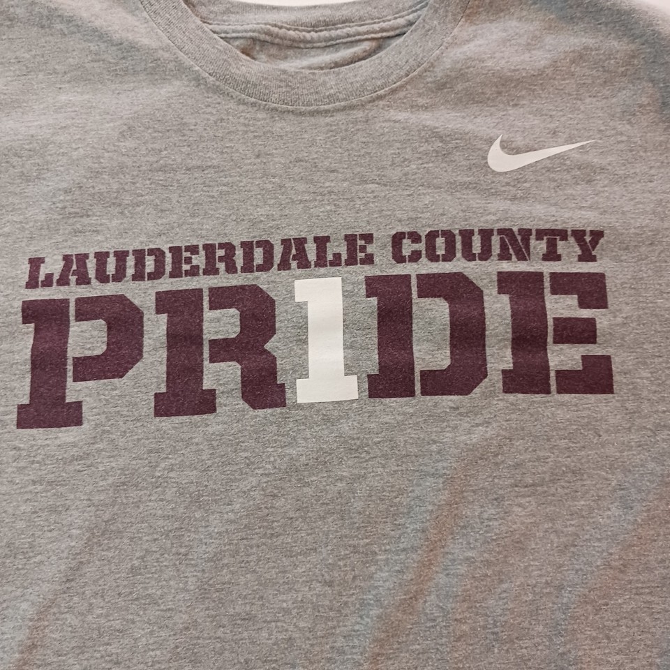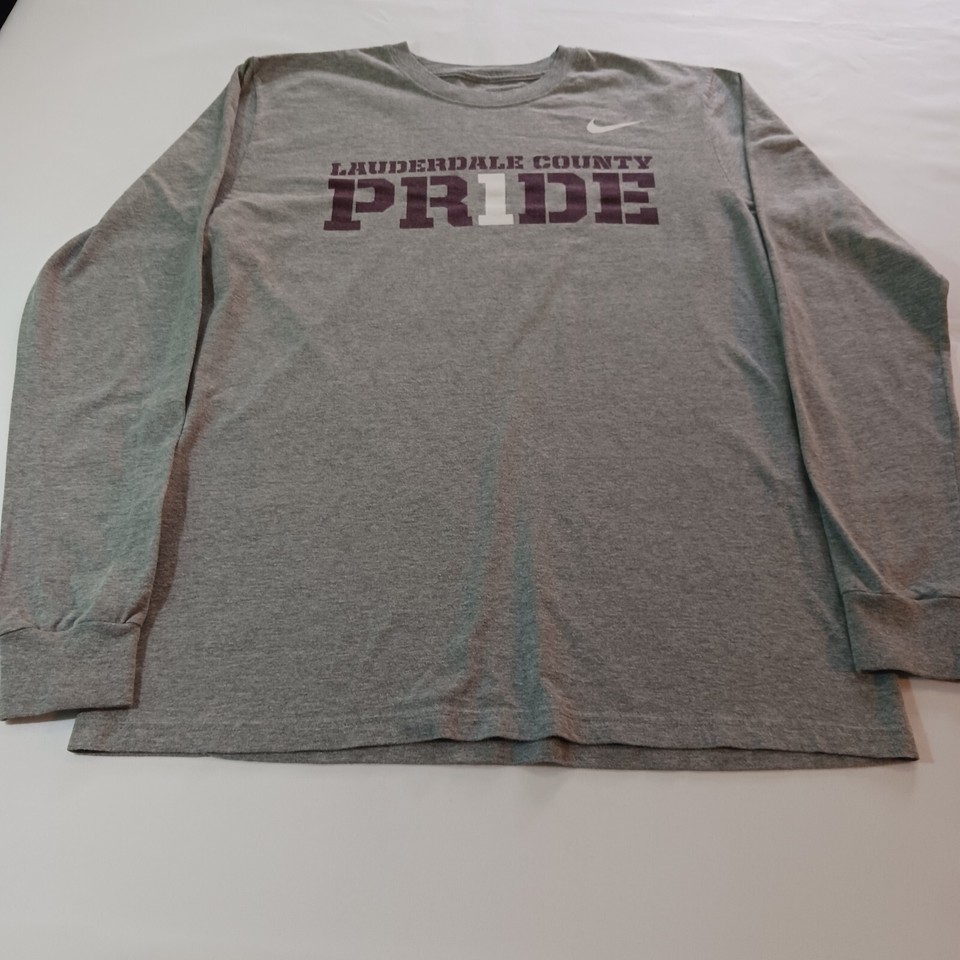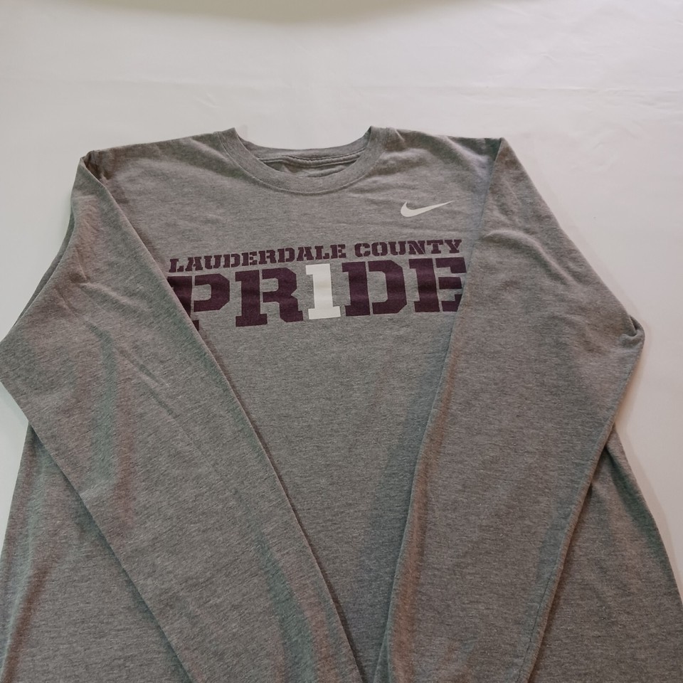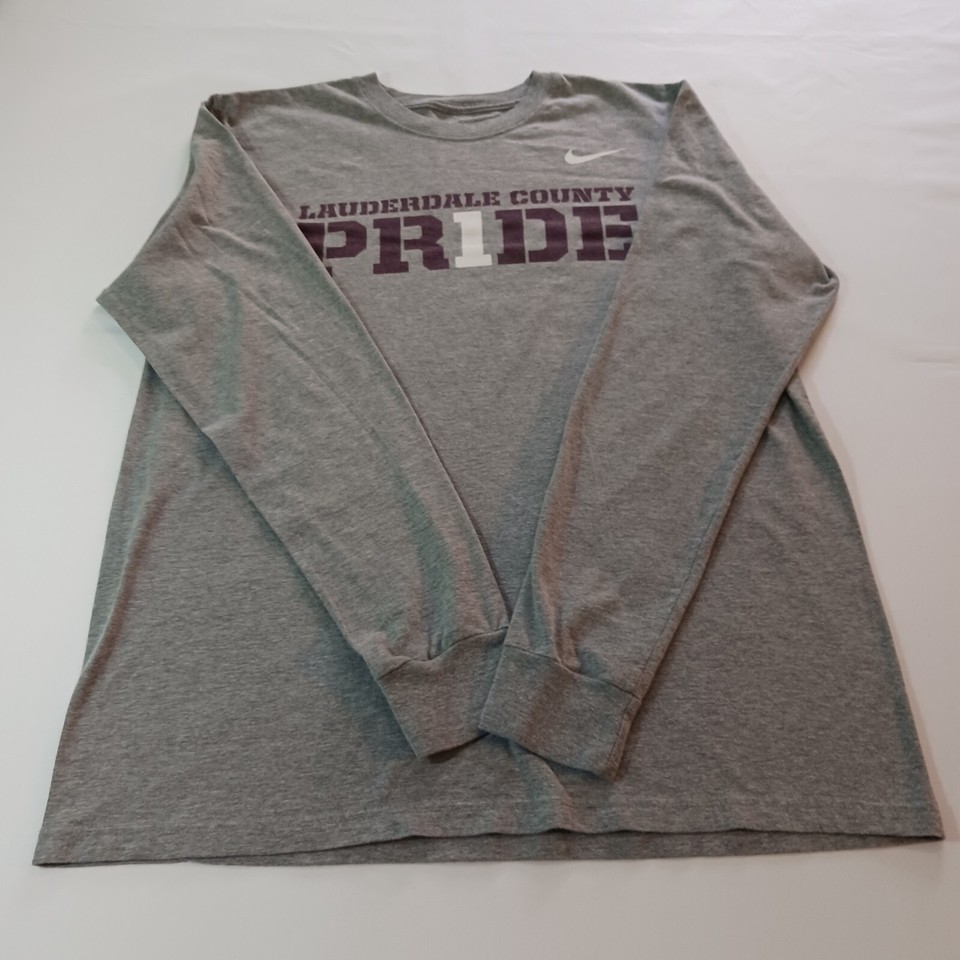 Show your pride for Lauderdale County with this Nike Men's Gray Long Sleeve Graphic T-Shirt, perfect for any sports enthusiast. Made with a blend of polyester and cotton, this pullover T-shirt features a crew neckline and easy care, lightweight fabric. The shirt is machine washable and comes in a regular fit, with a mild compression level.