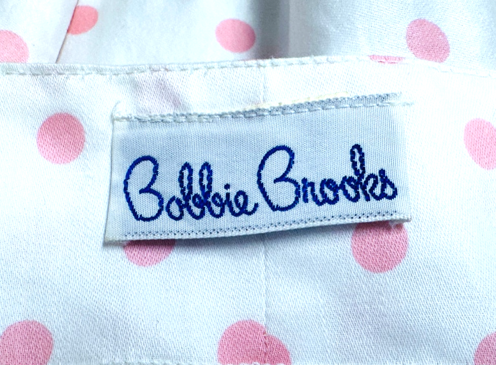 Darling 1950s Bobbie Brooks three-piece set in crisp 100% cotton ? a sleeveless white blouse with pink dots, a full pink circle skirt with white dots, and the original wide self-belt. A playful and iconic mid-century ensemble perfect for Rockabilly, pinup styling, or period costuming.