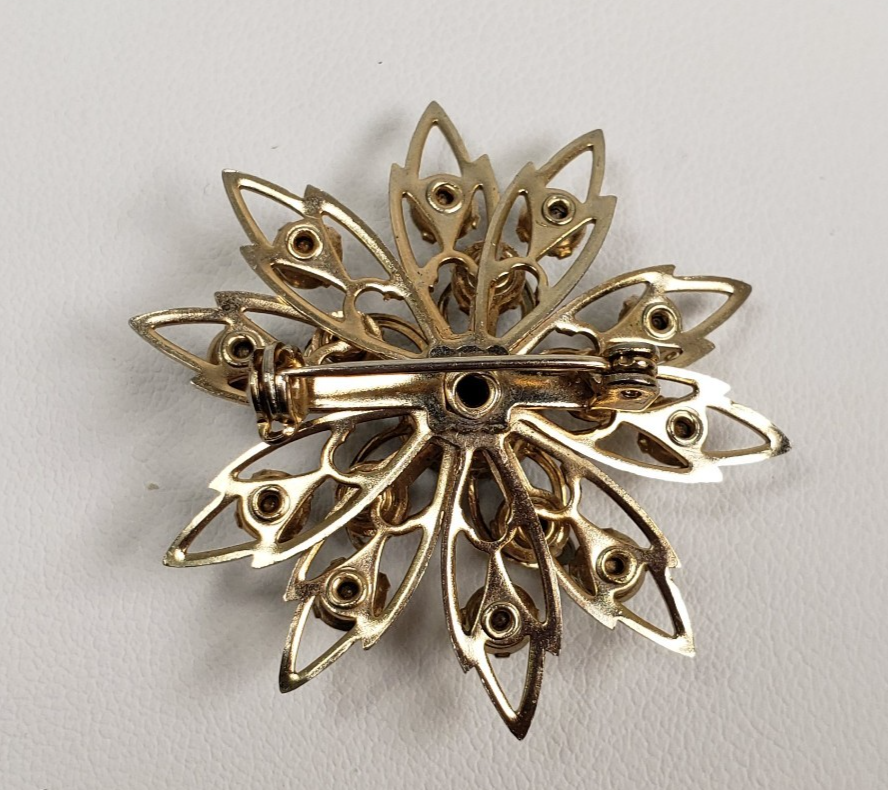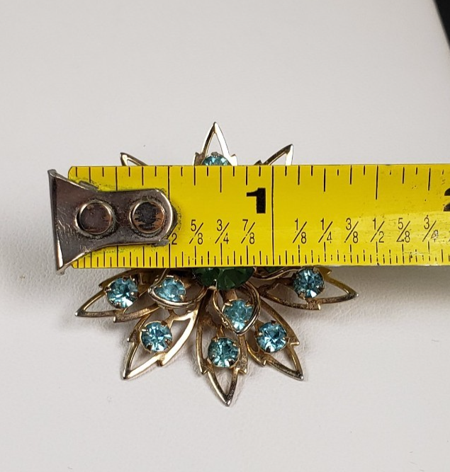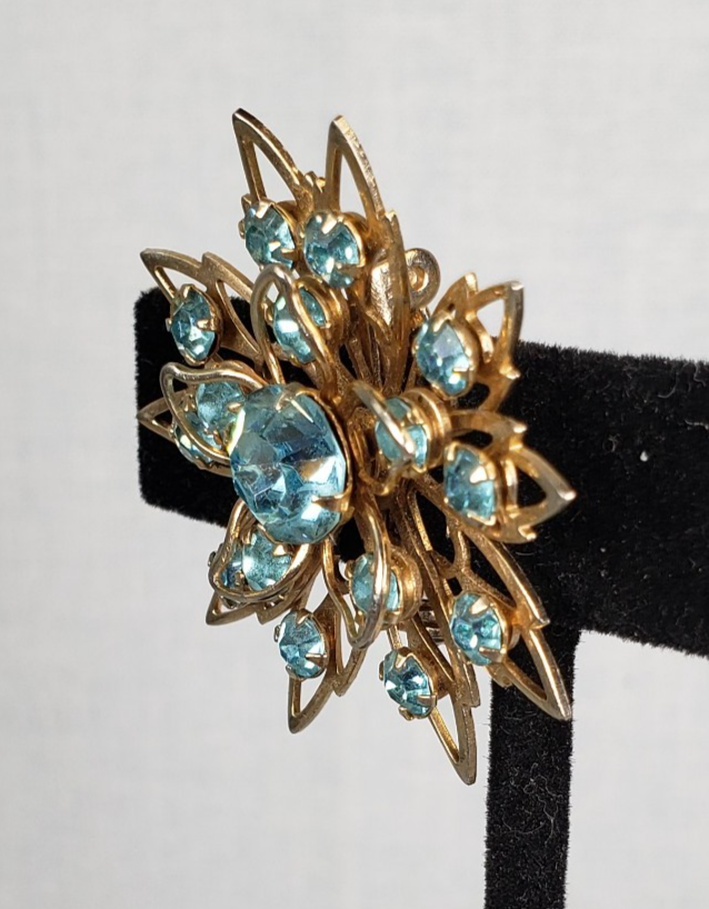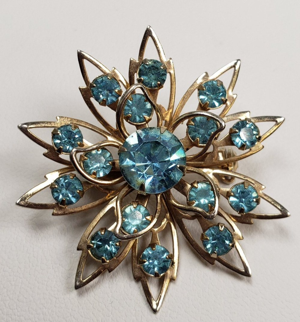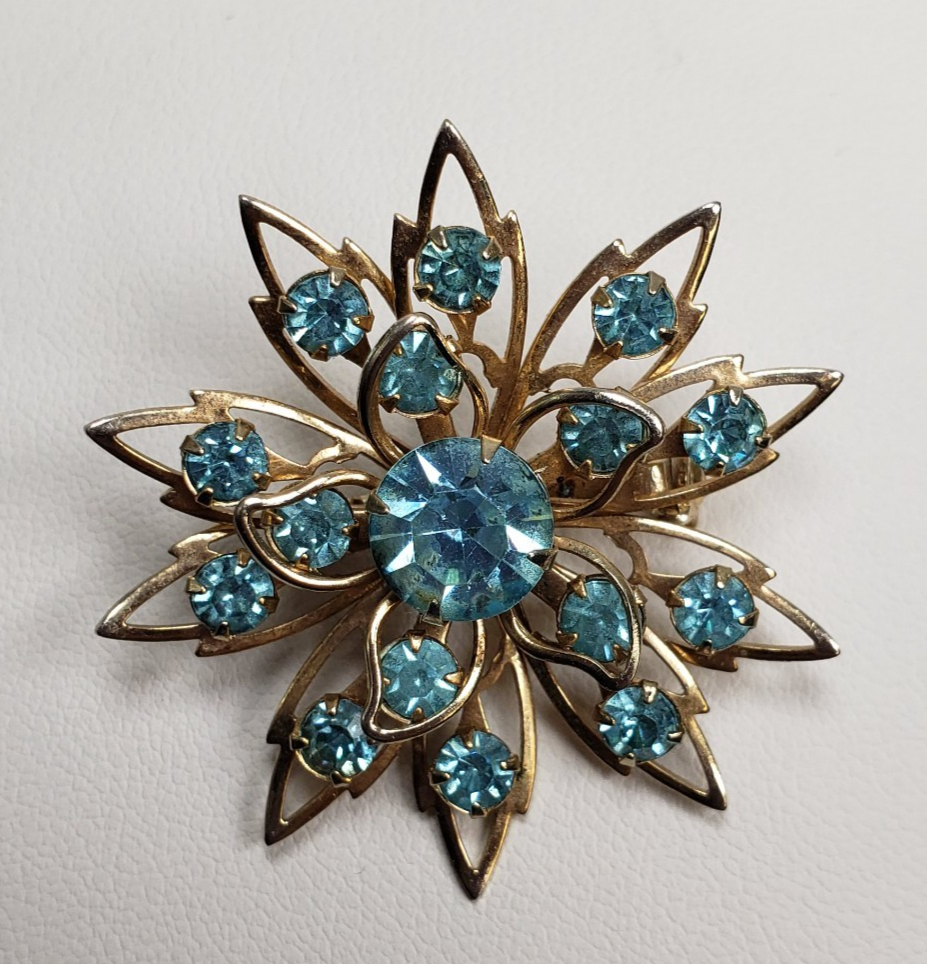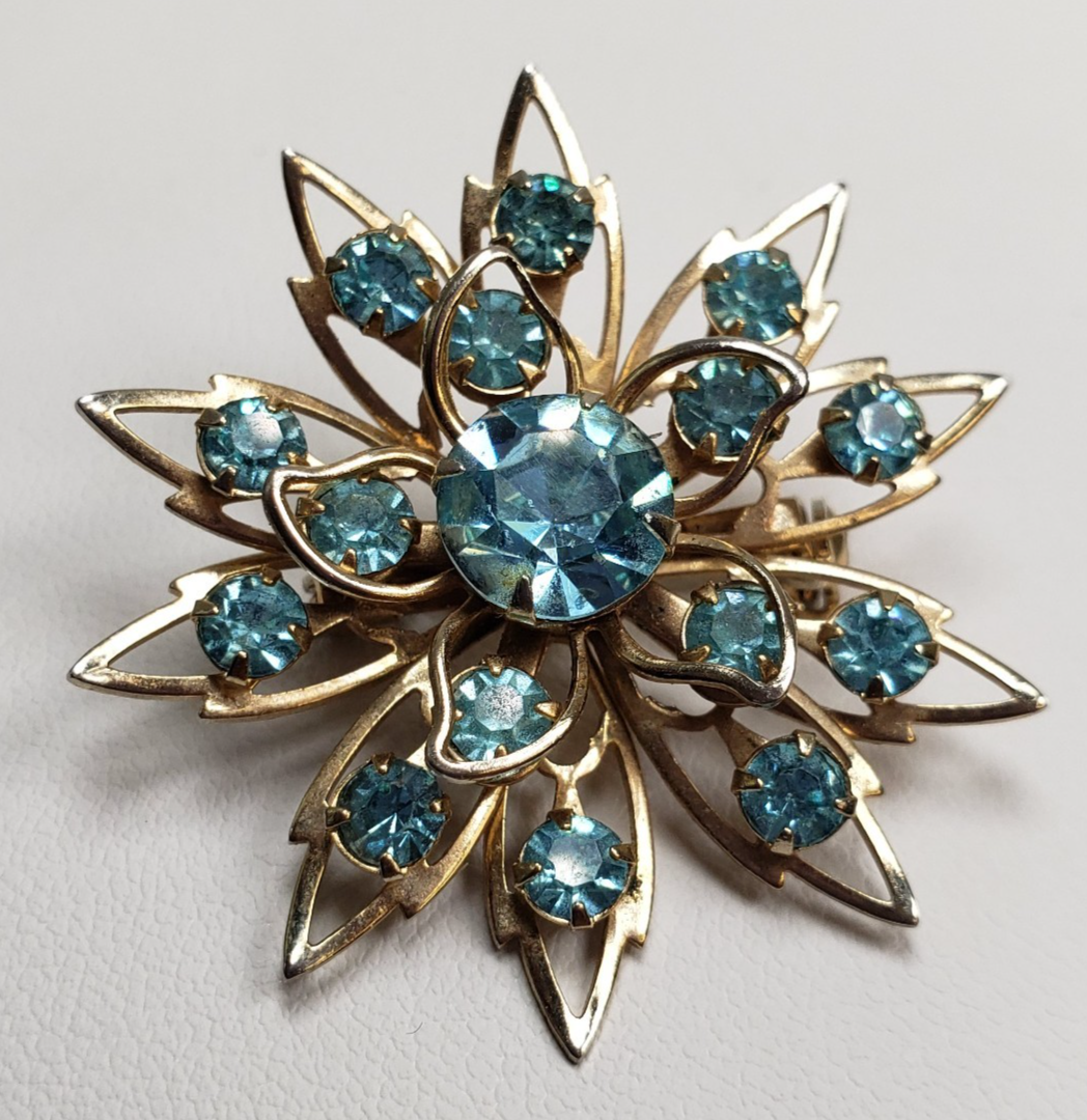 Vintage Starburst Aqua Blue Crystal Stones Winter Flower Snowflake Brooch