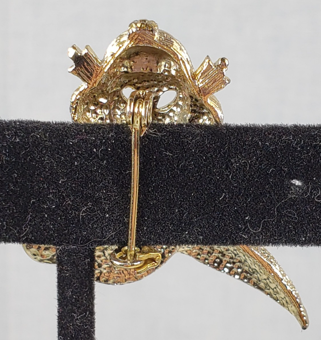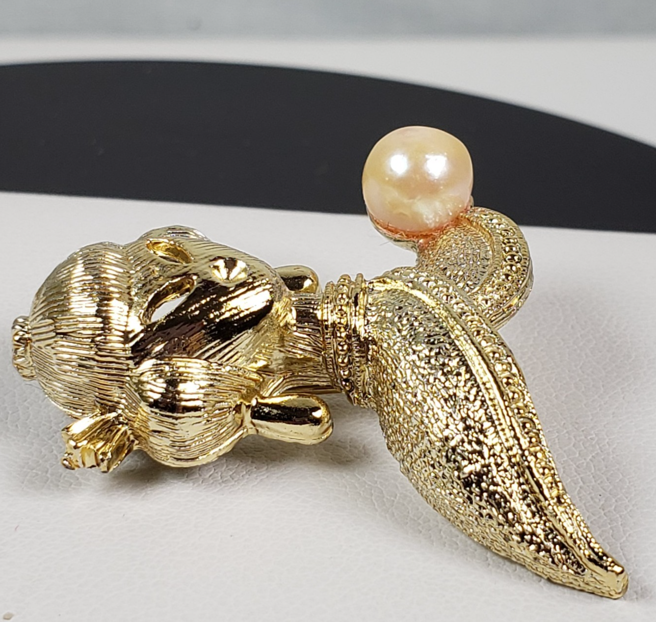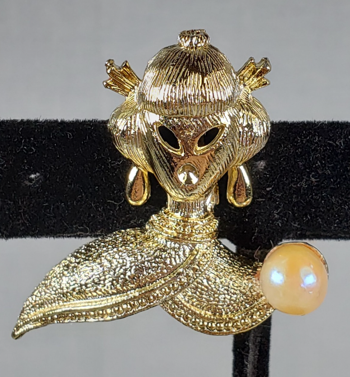 Vintage Mid Century Asian Geisha Lady Faux Pearl Yellow Gold Tone Brooch Pin