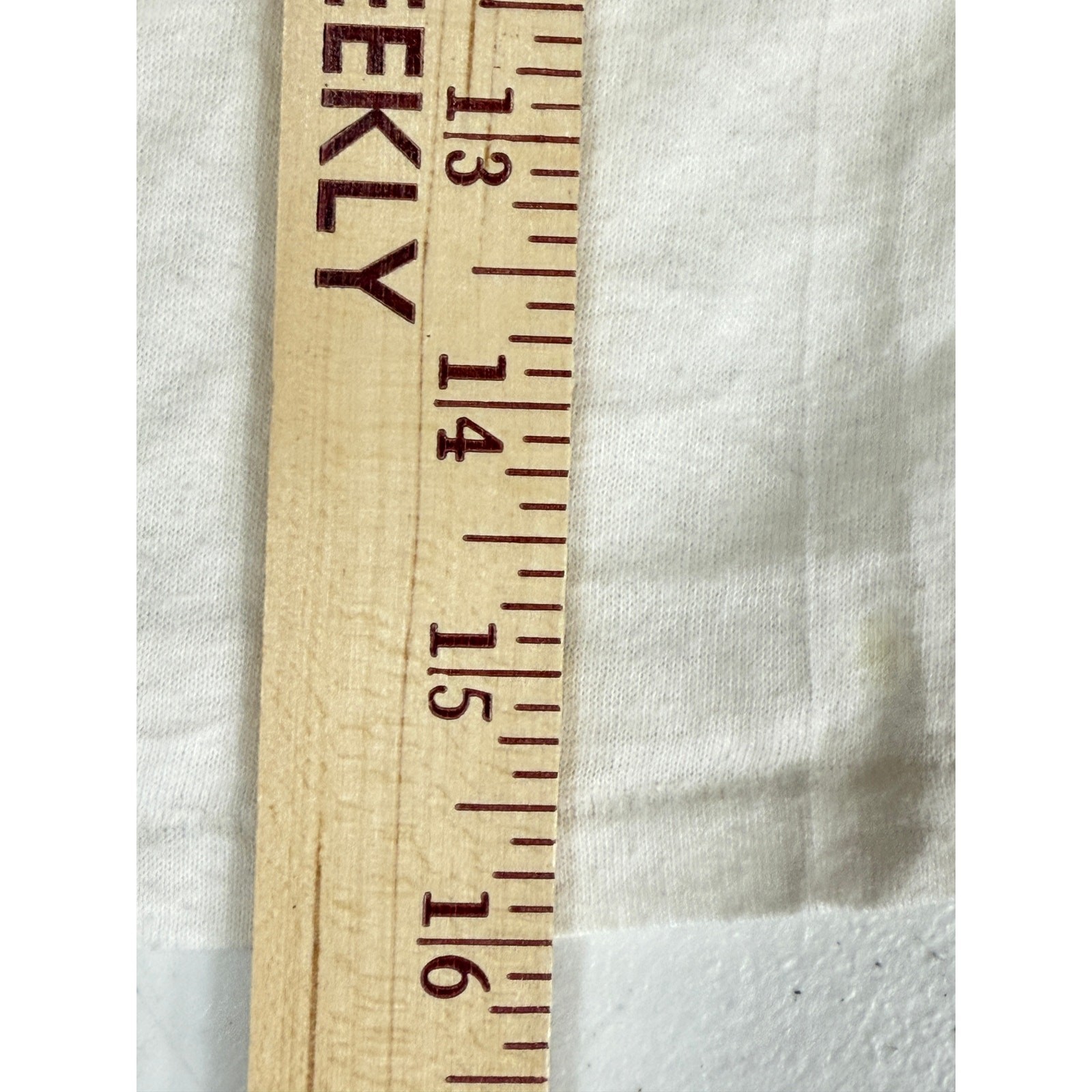 Good vintage condition with noted wear. One edge of the graphic (around a face) is missing, and there is some light darkening around the print. Otherwise strong, intact, and wearable ? distressed charm consistent with age.