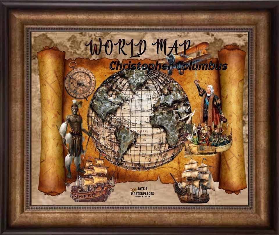 The product is a 16x20 framed wall art print of a world map featuring Christopher Columbus, created by artist Jaye Metcalfe. The multicolor print is made of vinyl and is oriented horizontally, making it suitable for teens and adults' rooms such as the office or living room. With a vintage style and featuring a reproduction of the artwork, this framed wall art adds a touch of art and world map theme to any space, making it an easy-care addition to modern home decor.
