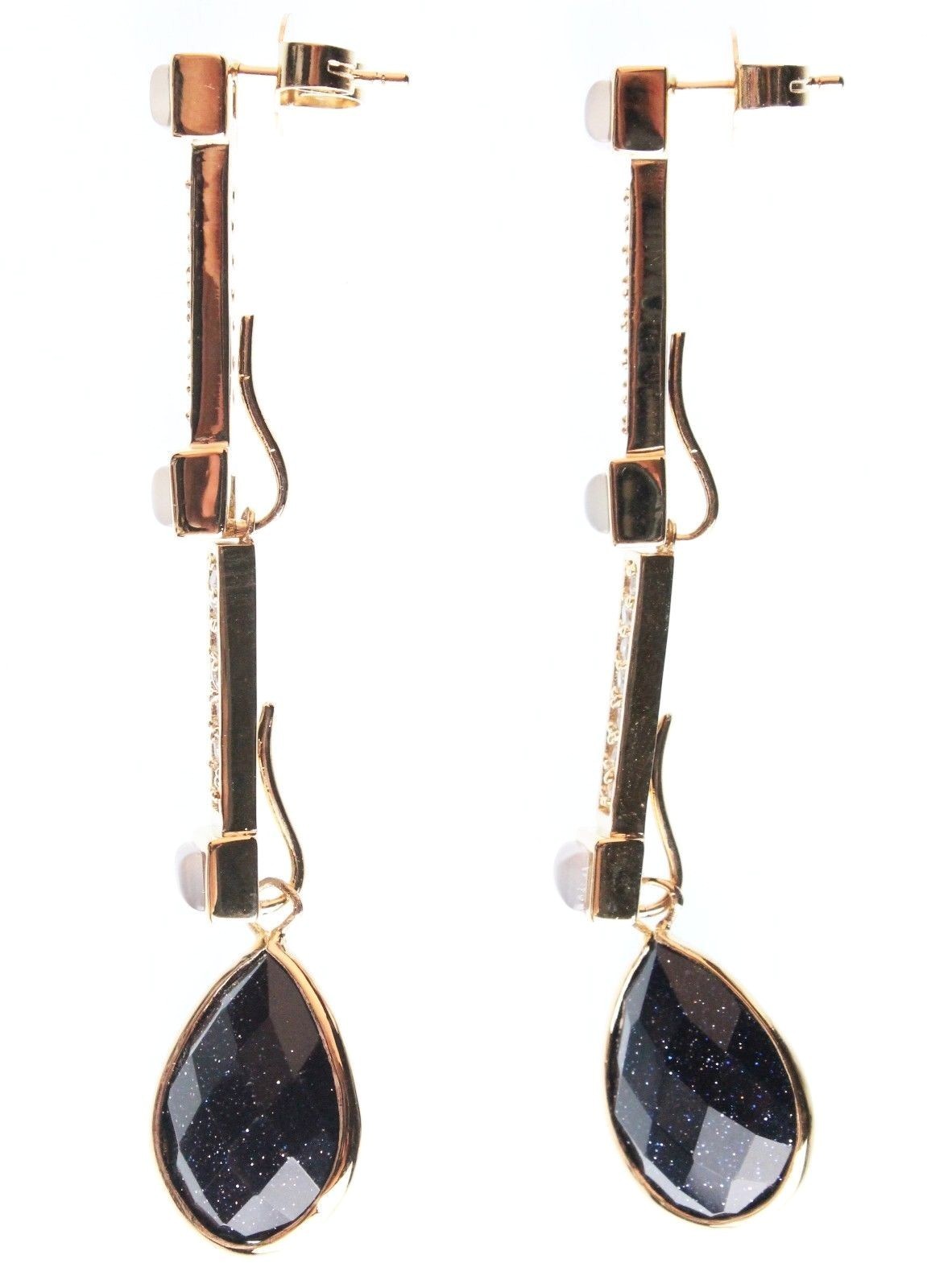 Questo e per una nuovissima coppia di orecchini lineari lineari Daniela Swaebe 18K Gold Crystal Blue Goldstone Drop) Il calo totale e di 3 pollici La pietra oro blu a forma di lacrima misura 18 mm x 14 mm