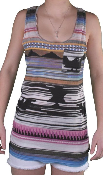Esto es para una nueva camiseta de bolsillo de bolsillo de impresion nativa de estampado para mujer, bancos de banca, bancos El tanque de chaleco orian de banco presenta un diseño de múltiples colores en la parte delantera con un logotipo solido de espalda y banco en el cuello Chaleco sin mangas Diseño de múltiples colores Espalda solida Logotipo de banco Bolsillo delantero
