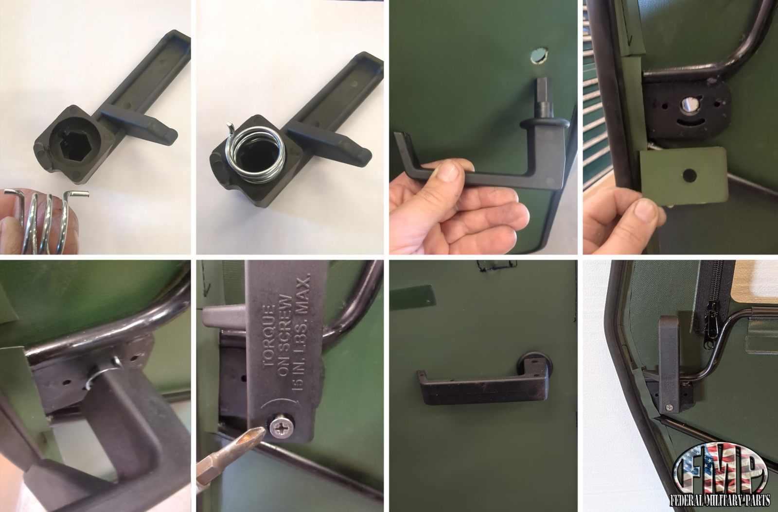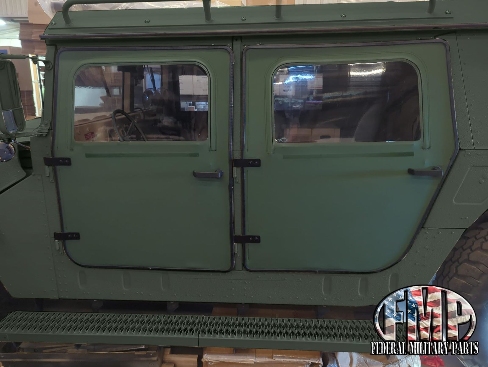 New soft canvas doors, Set of 2 Front or Rear, made for military vehicles including compatible with HUMVEE. 383 Nato Green. Includes 2 male hinge halves and a door handle per each door.