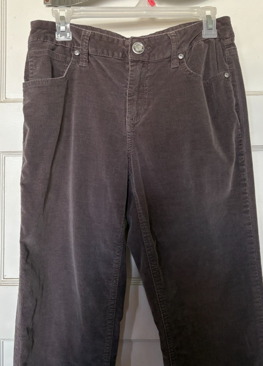 New Directions Weekend Grey/Brown Straight Leg Corduroy Pants Size 12. Gray/brown straight leg Corduroy pants by New Directions. Classic design with a comfortable fit. Waistband measures 32?. Inseam is 30?. Rise is 9.75?. Total length from the top of the waistband to hem is 40?. 98% Cotton, 2% Spandex and Machine Washable. Very Good Used Condition - See photos for further description.