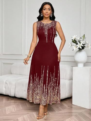 Product description: Elevate your wardrobe with this stunning Trendy Tron Navy Blue Sleeveless Dress. This elegant A-line gown features a flattering high waist design with beautiful pleating and contrast sequin details that catch the light perfectly. The round neckline and sleeveless tank style create a timeless silhouette, while the flared hem adds graceful movement. Crafted from premium knitted fabric composed of 91% Polyester and 9% Elastane, this dress offers medium stretch for a comfortable slim fit that flatters your figure. The all-over print pattern makes this piece truly special for homecoming events or festive celebrations. Complete with a convenient zipper closure, this long dress combines sophistication with practicality. Machine washable with soft detergent for easy care. Available in multiple color options including Burgundy, Silver, and Navy Blue, and sizes S through XL.