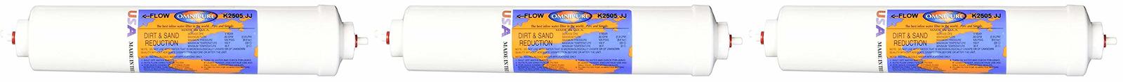 The Omnipure K2505-JJ Sediment Inline Cartridge has a flow rate of 0.5 gpm. The Omnipure K2505-JJ Sediment Inline Cartridge is a 10" polypropylene filter that removes dirt, sand, and sediment to the 5 micron level.. 2" x 10" with quick-connect 1/4" FQC connection for easy installation.