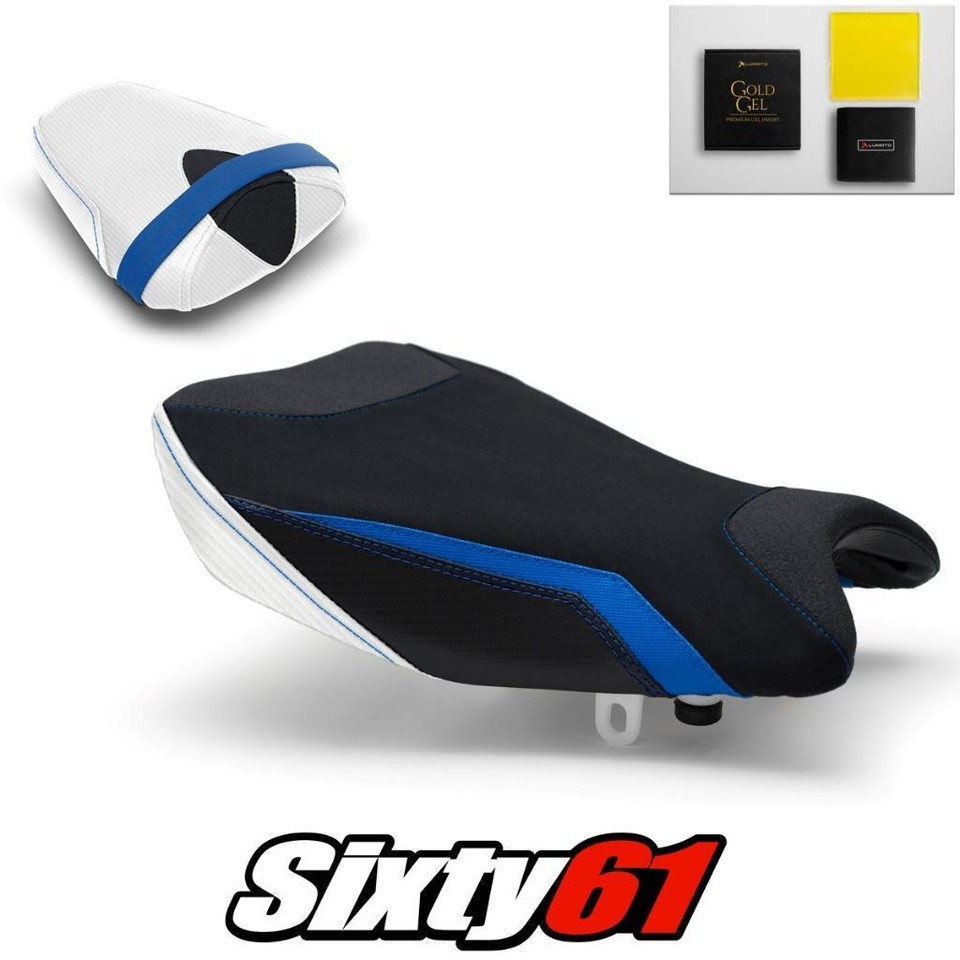 Suzuki GSXR 1000 Seat Covers and Gel 2017-2024 Blue White Luimoto Tec-Grip Suede