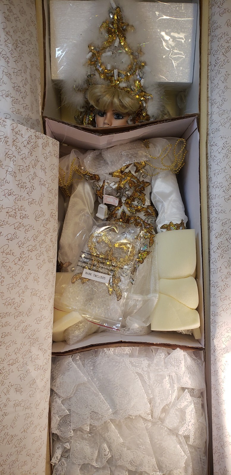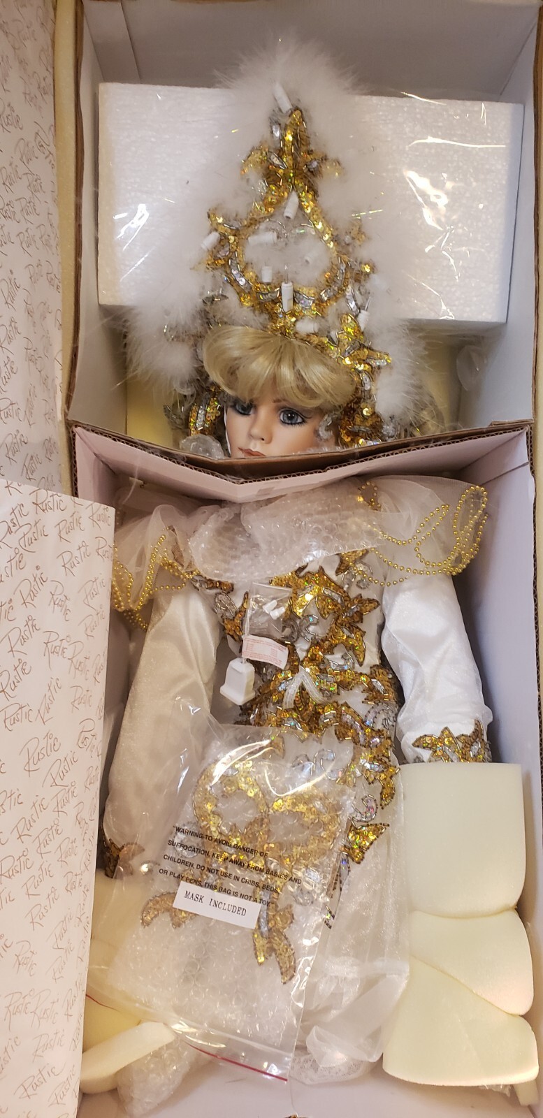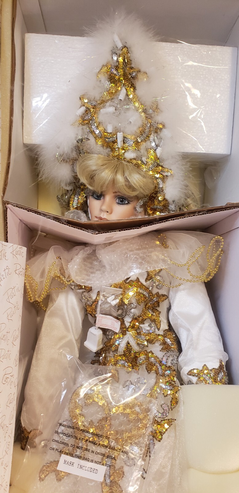 Make a dramatic statement with this limited edition 42" porcelain doll, "Crystal ? Queen of Mardi Gras" by renowned artist Rustie. Created for the Welden Museum of Fine Collectibles, this showstopping piece dazzles with an illuminated jeweled costume, elaborate mask, and ornate details from head to toe. A rare collector?s piece, especially with working lights and original packaging.