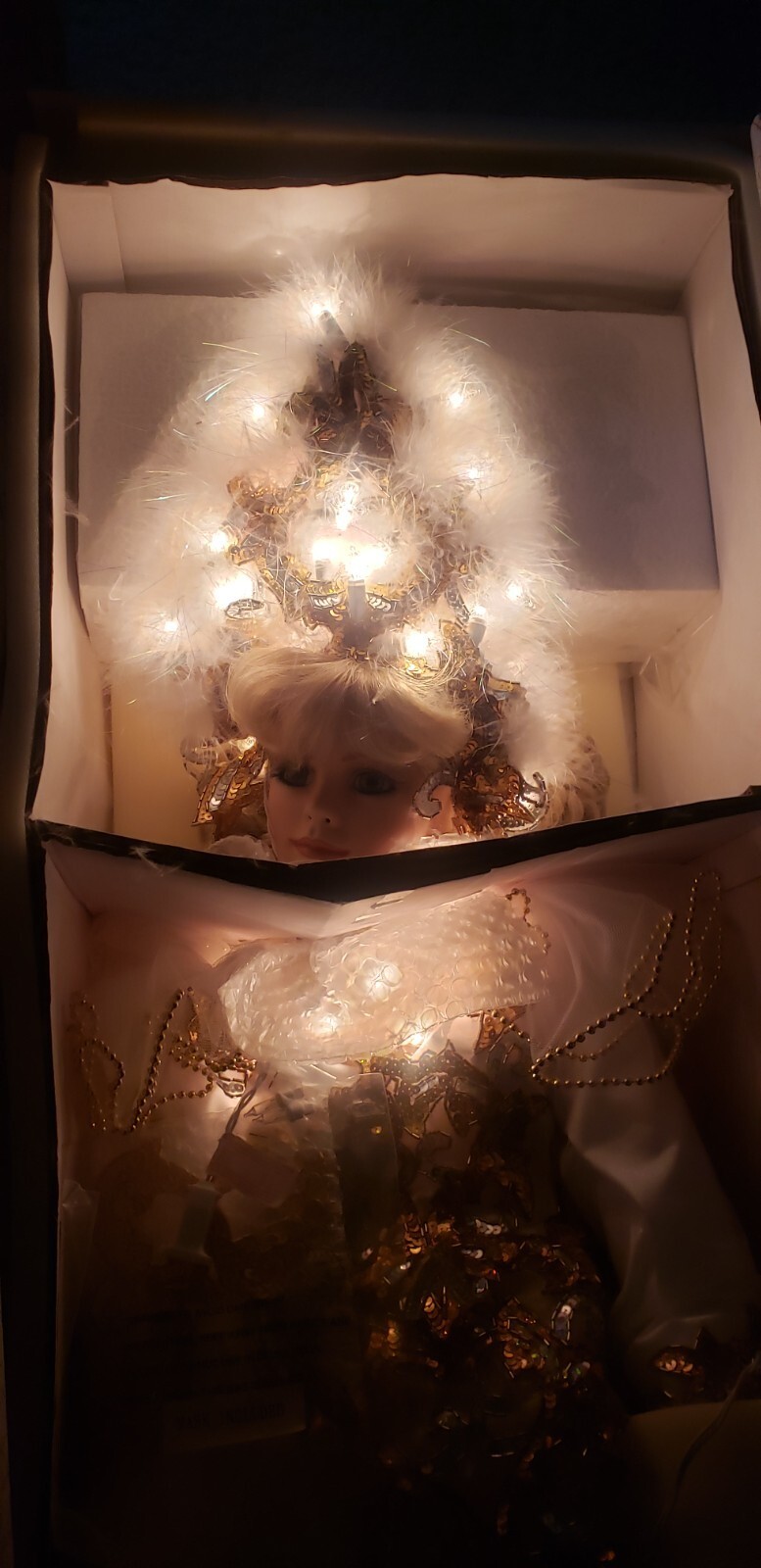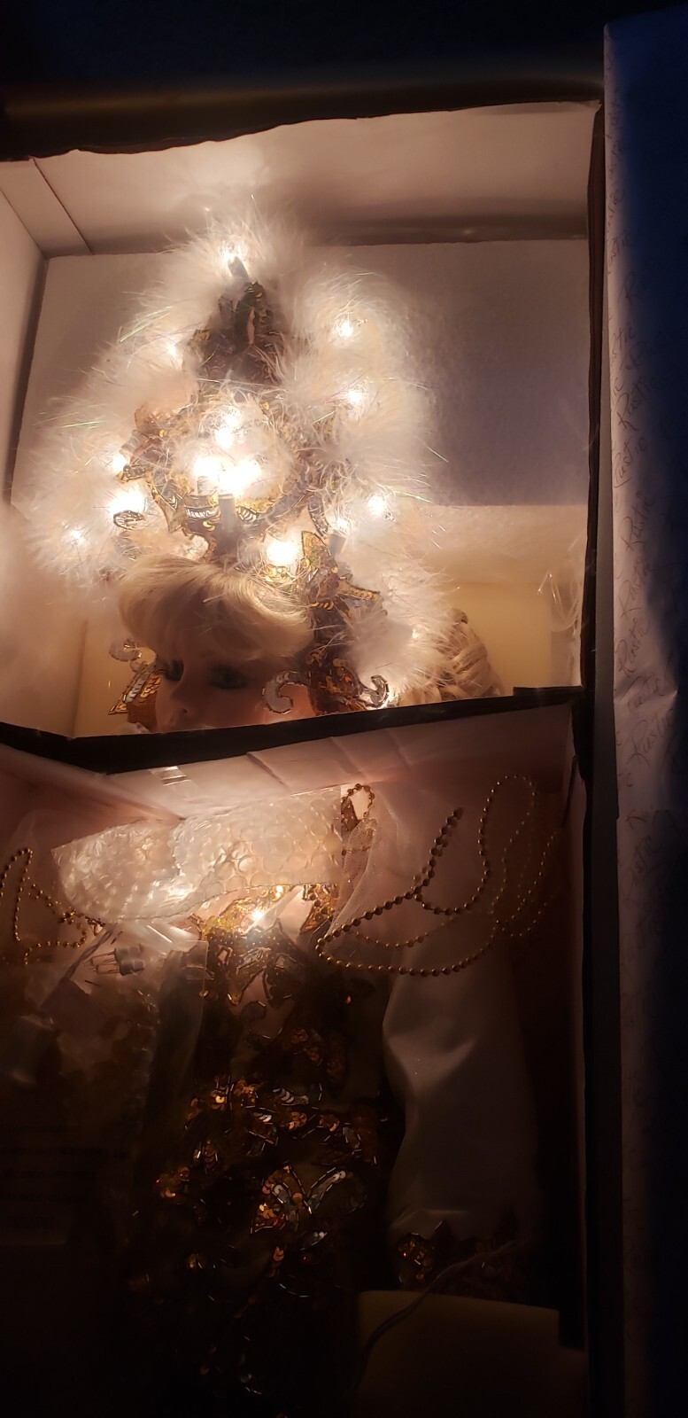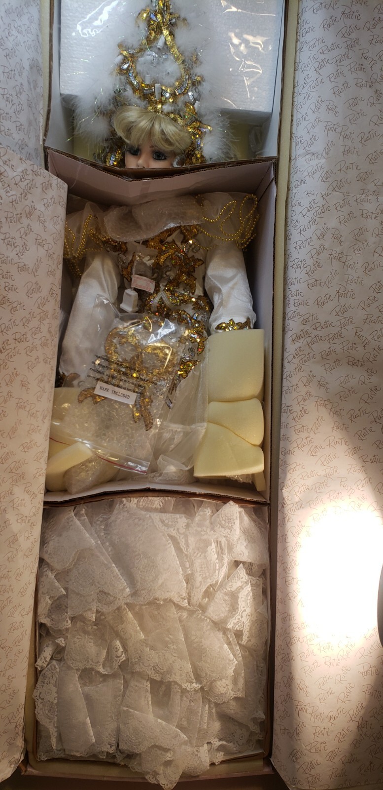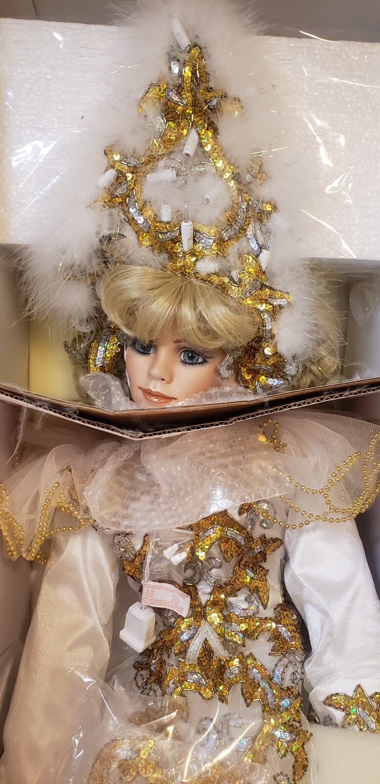 Make a dramatic statement with this limited edition 42" porcelain doll, "Crystal ? Queen of Mardi Gras" by renowned artist Rustie. Created for the Welden Museum of Fine Collectibles, this showstopping piece dazzles with an illuminated jeweled costume, elaborate mask, and ornate details from head to toe. A rare collector?s piece, especially with working lights and original packaging.
