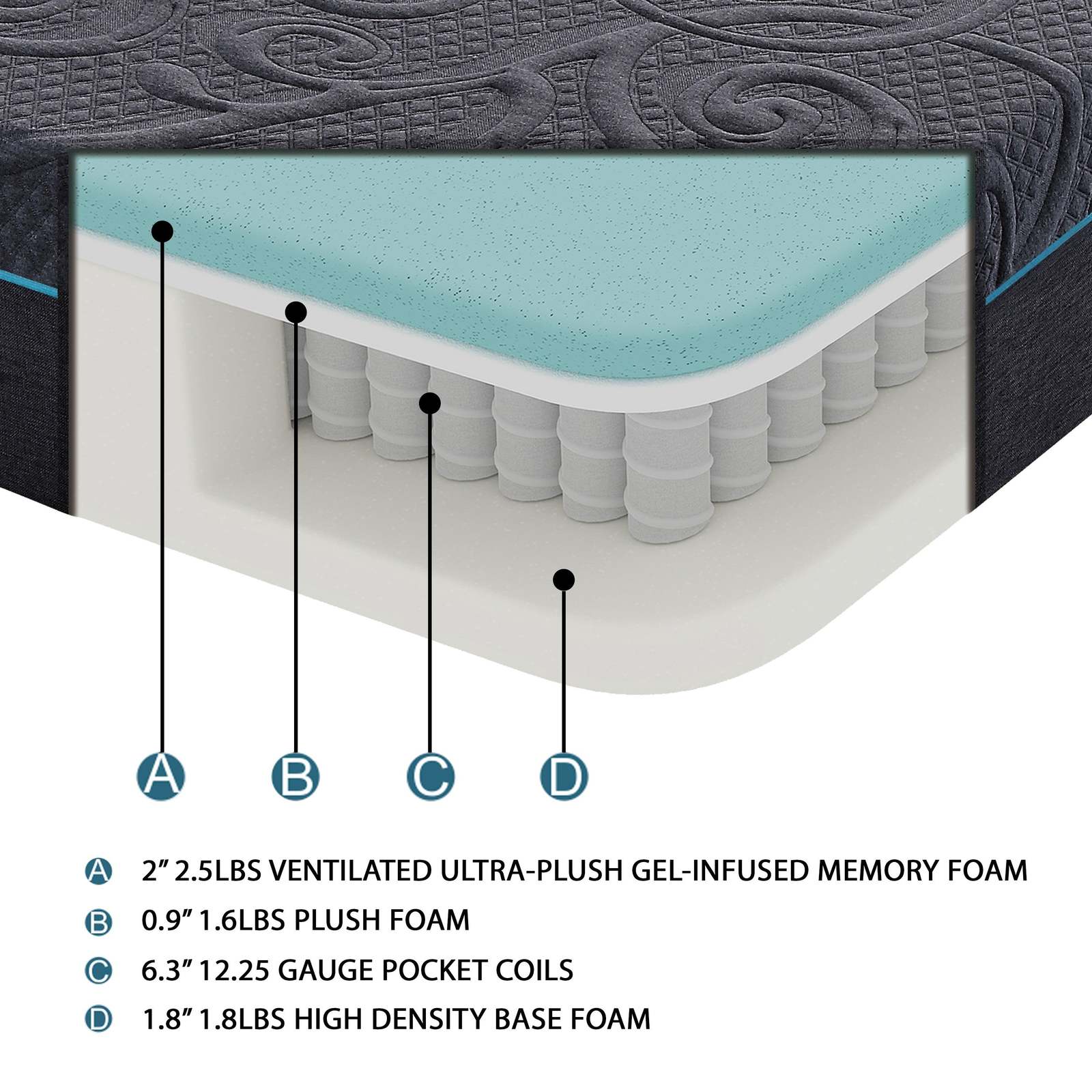 This Collection presents our line of hybrid gel-infused memory foam mattresses that form to your body, creating a customized sleep experience that is as unique as you are. The fabric covering the mattress is breathable, which allows for a comfortable night?s sleep no matter the season. Our 11-inch mattresses feature four-layer construction that consists of: 2-inches ventilated ultra-plush gel-infused memory foam, 0.9-inch plush foam, 6.3-inch 12.25 gauge pocket coils and 1.8-inch of high-density base foam ? and are offered in Twin, Full, Queen, Eastern King, California King. This Collection?s selection creates the perfect fit for your personal sleep experience.