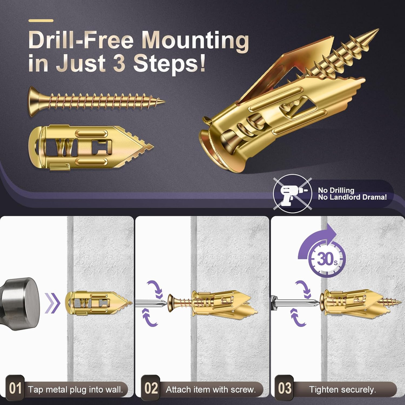 ?No Drilling, No Damage ? Perfect for Renters DIYers!? Skip the power drill?done in 60 seconds! Adjust or remove screws anytime (anchor stays in place) with zero visible holes. Fix mistakes worry-free, ditch flimsy hardware, and avoid ugly rust stains or deposit-losing damage. Ideal for apartments, dorms, and quick upgrades!